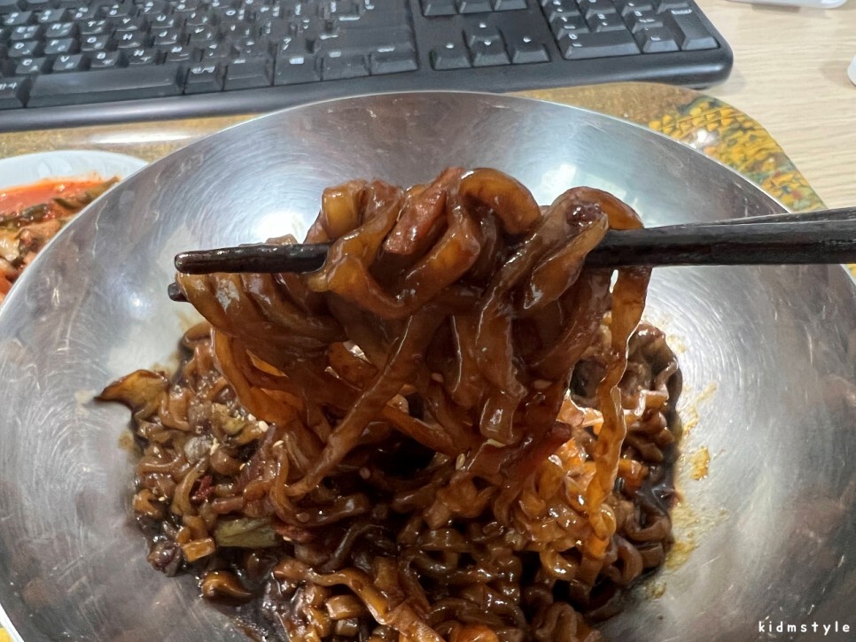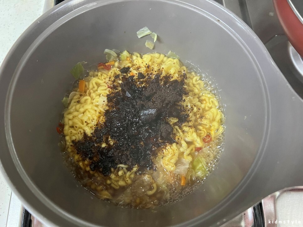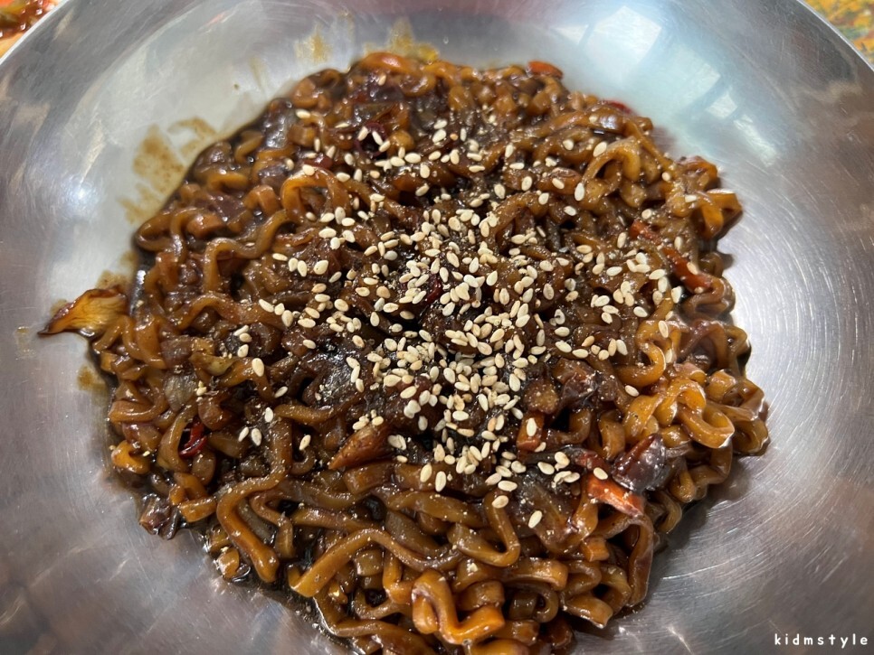고추짜장스프와 풍미유를 넣고 비벼주면 되는데 나는 고추짜장스프만 넣고 약불에 끓이면서 비벼주는 편이다. 이렇게 하면 더 맛있다.
