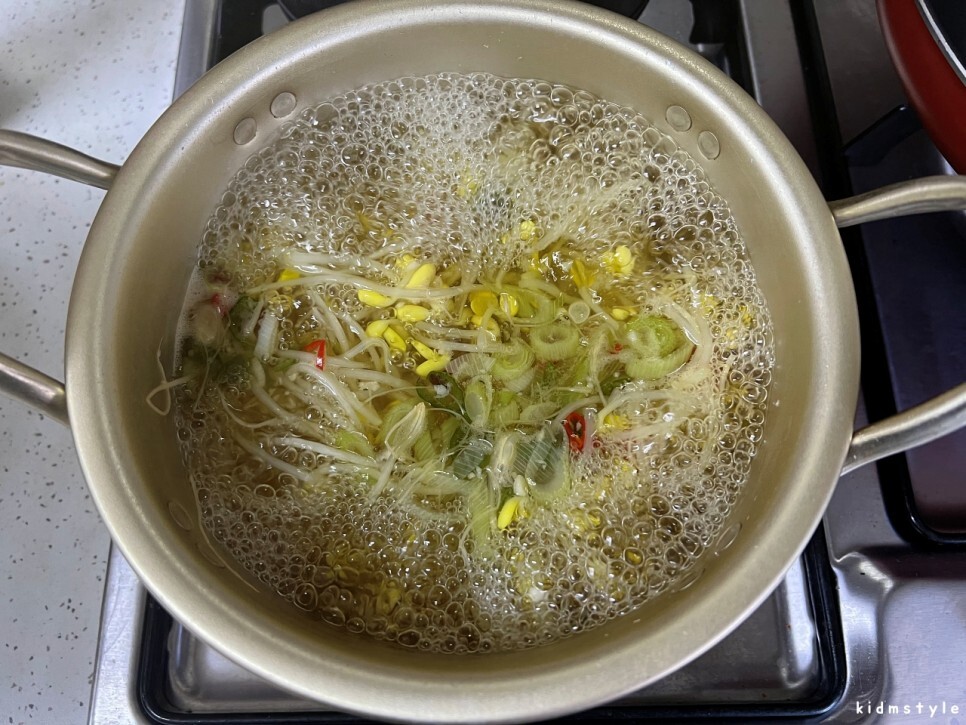 콩나물국은 팔팔 끓여야 제맛이다. 간을 세게 하지는 않는다. 엄마표 집간장 조금, 땡초, 소금 약간만 넣고 끓인다.