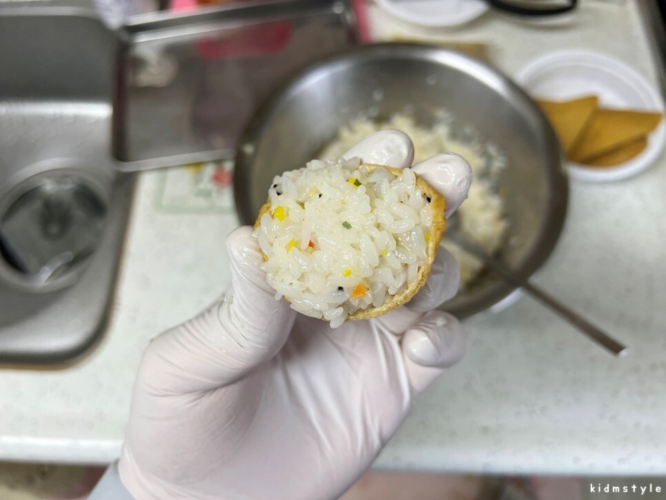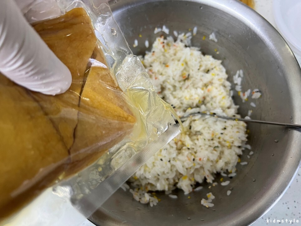 유부피를 가위로 자르고 국물을 밥에 조금 더 넣어준다.