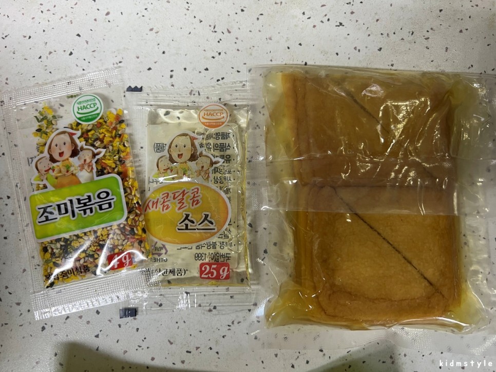 유부피, 조미볶음, 새콤달콤 소스 (단촛물)이 2개씩 들어가 있다.