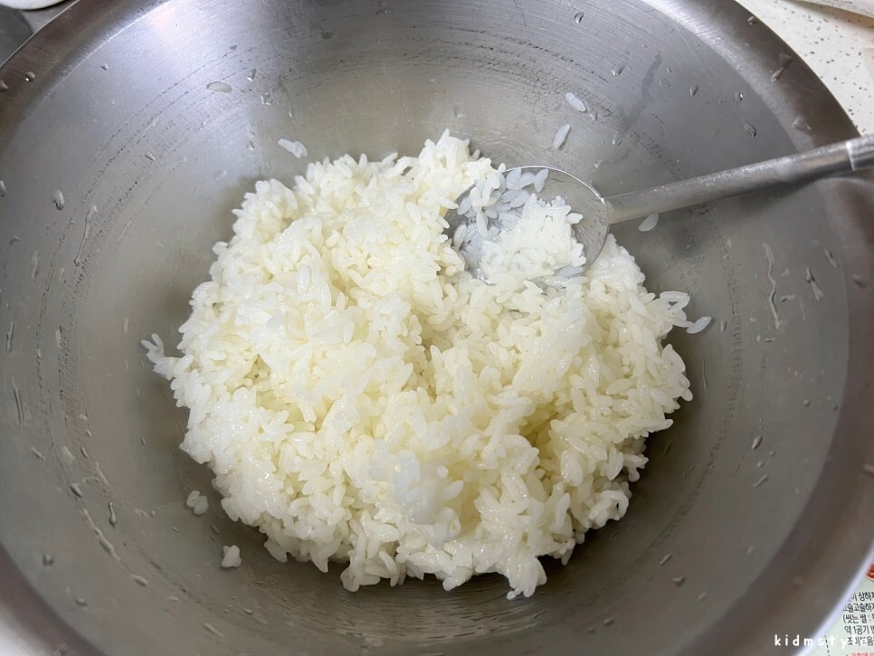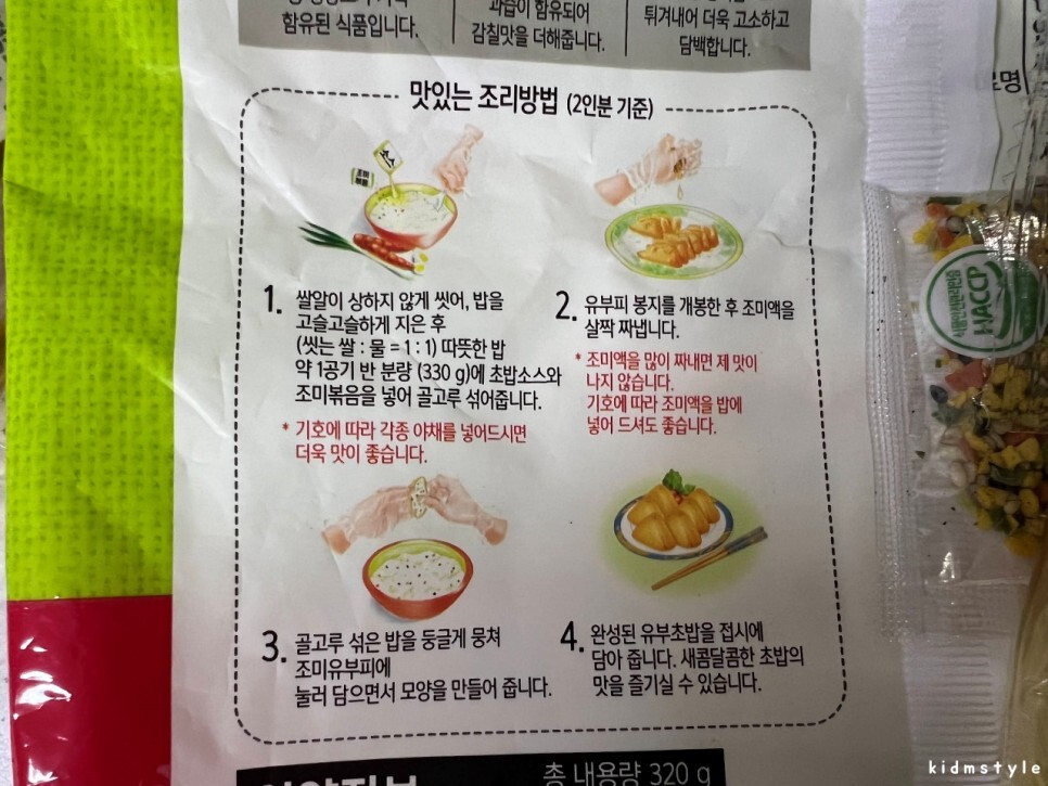 유부 조리법을 보니 2인분 기준으로 밥 330g이 필요하다. 일단 햇반 2개만 돌려보자.