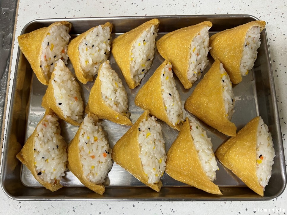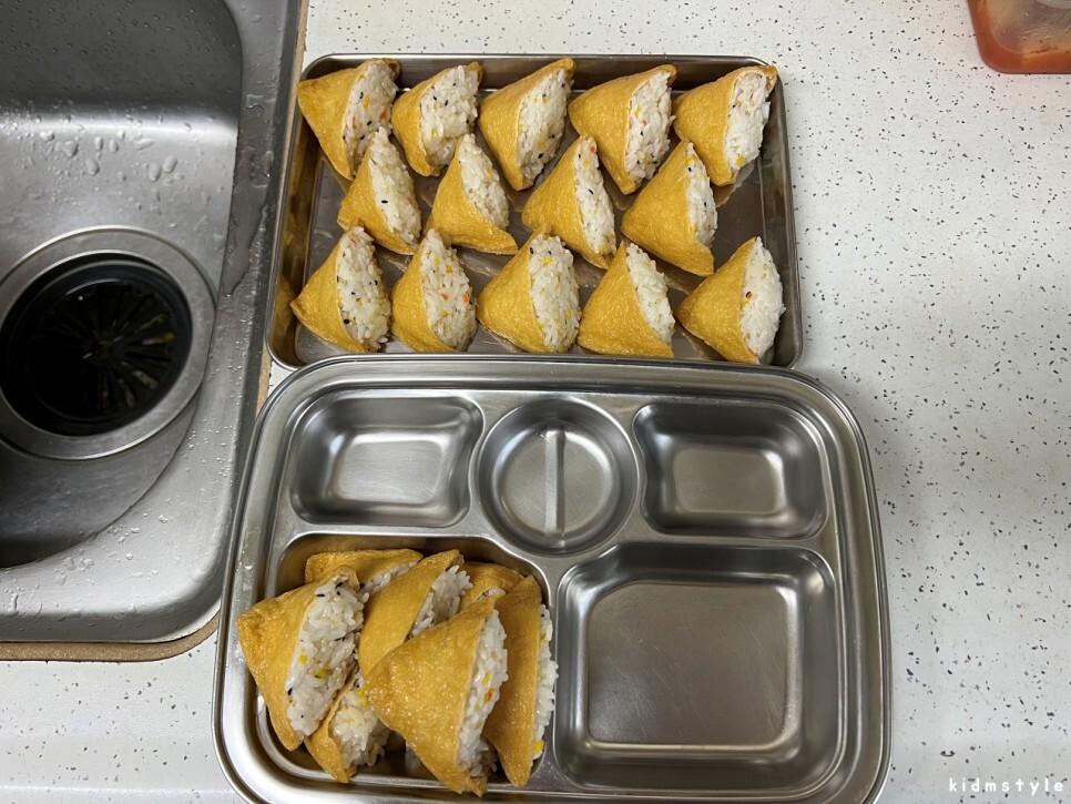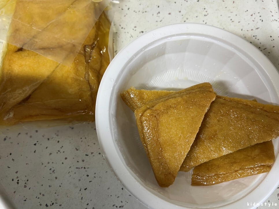 이 제품은 삼각형이라 좋다. 사각형 유부피보다 삼각형 모양이 밥을 넣기가 더 쉽다.
