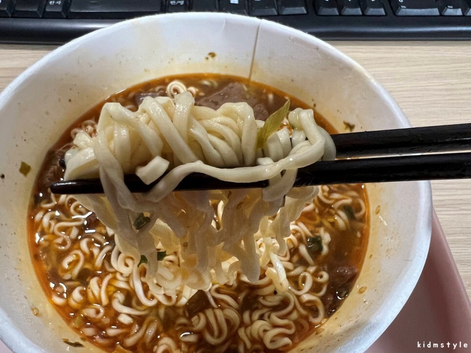 면은 우리나라 큰 사발면보다 조금 얇은 편이다. 면을 잡아올려서 입에 넣는 순간부터 고추기름의 매콤함이 같이 느껴진다. 국물 첫맛은 매콤한데 쭉 마셔보니 상당히 깊은 맛이 나면서 깔끔하다. 맛있다.