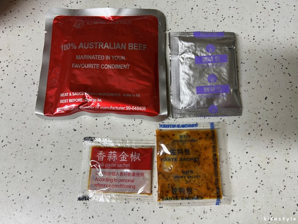 소스는 총 4가지가 들어가 있다. 왼쪽 위부터 시계 방향으로 1, 2, 3, 4로 보면 1, 4번 스프는 물을 넣고 다 익었을 때 넣으면 되고 2,3번 스프는 지금 바로 넣으면 된다.