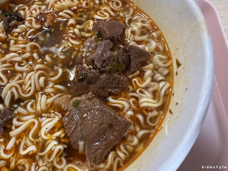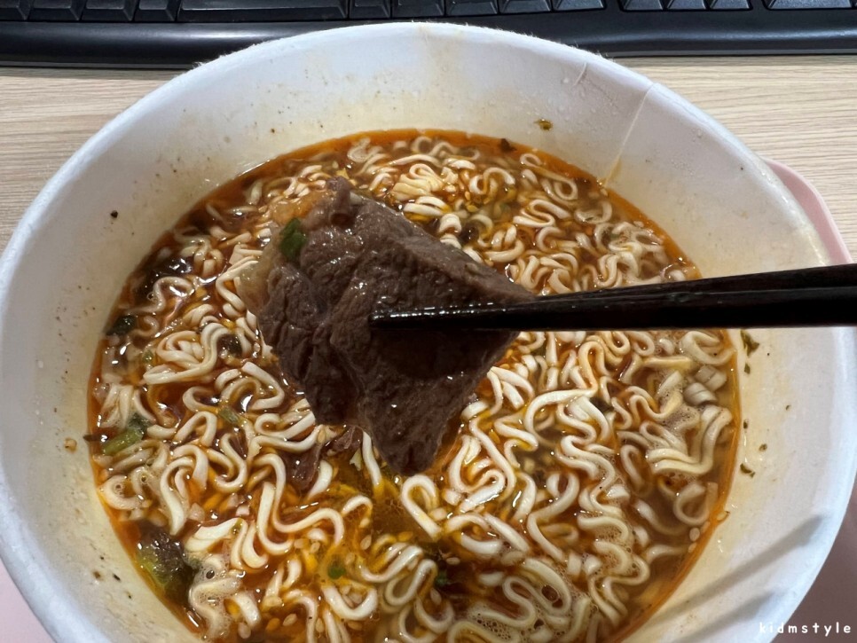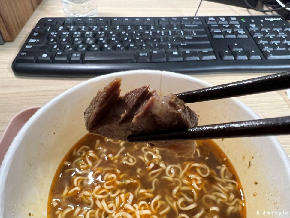 비주얼이 너무 좋다. 고기가 정말 실하게 들어가 있다. 뭔가 아쉬워서 전자레인지에 컵라면을 1분 더 돌렸다. 딱 좋다.