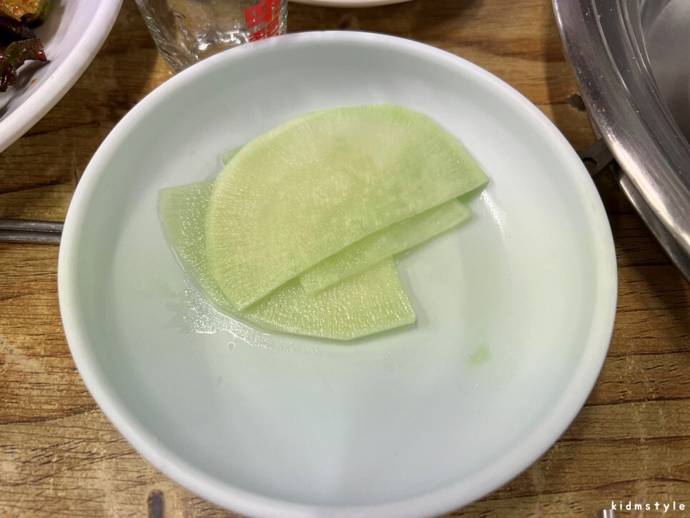 색깔 입힌 쌈무도 아삭한 게 맛이 좋다.