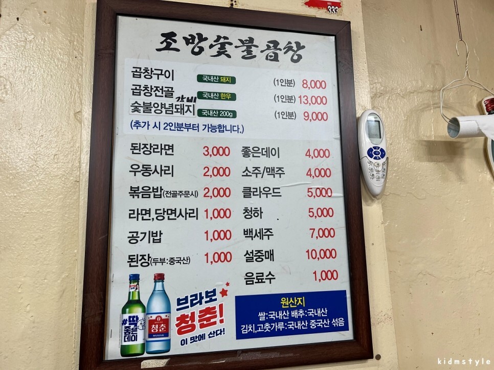 메뉴판을 찍어본다. 곱창구이는 국내산 돼지곱창, 곱창전골은 국내산 한우, 숯불양념돼지는 국내산이다. 가격이 합리적이고 회전이 빠른 집이라 재료가 신선하다. 장사가 잘 되는 집은 이 부분이 상당히 장점이다. 우산 곱창구이 6인분을 주문해 본다.