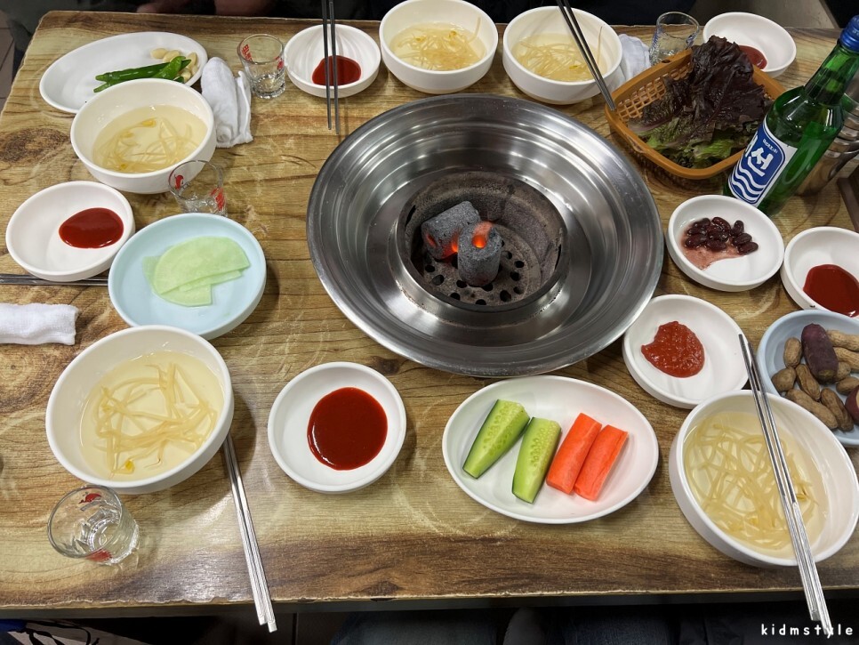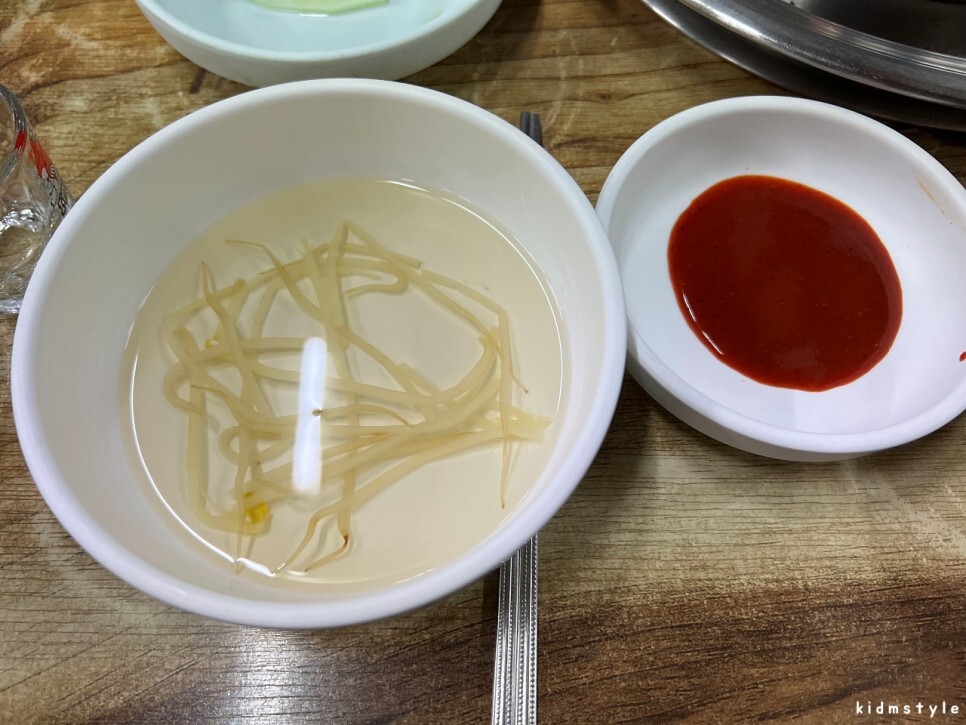 기본 반찬 중 시원하게 나오는 콩나물국은 무심한 듯하면서도 곱창과 잘 어울려서 계속 리필을 하게 된다. 빨간 소스는 곱창을 찍어 먹으면 합이 딱 좋다.
