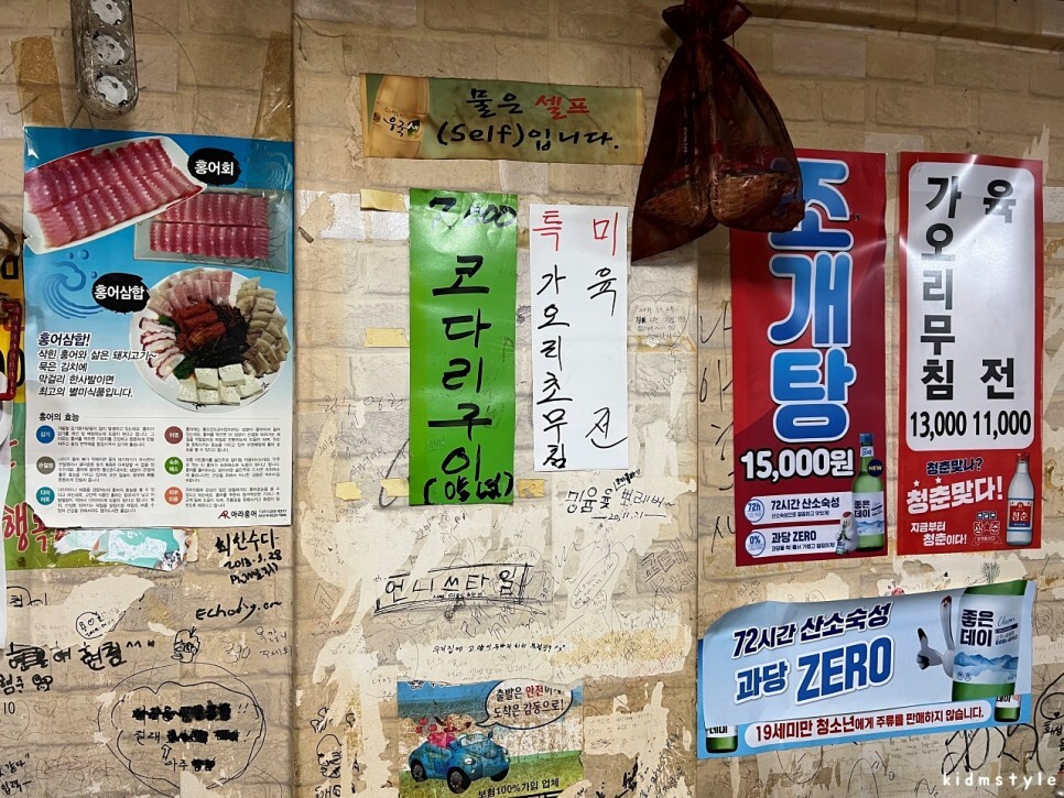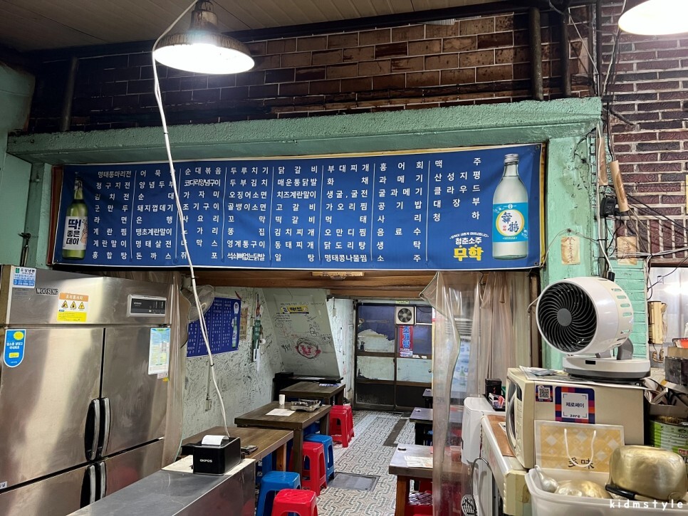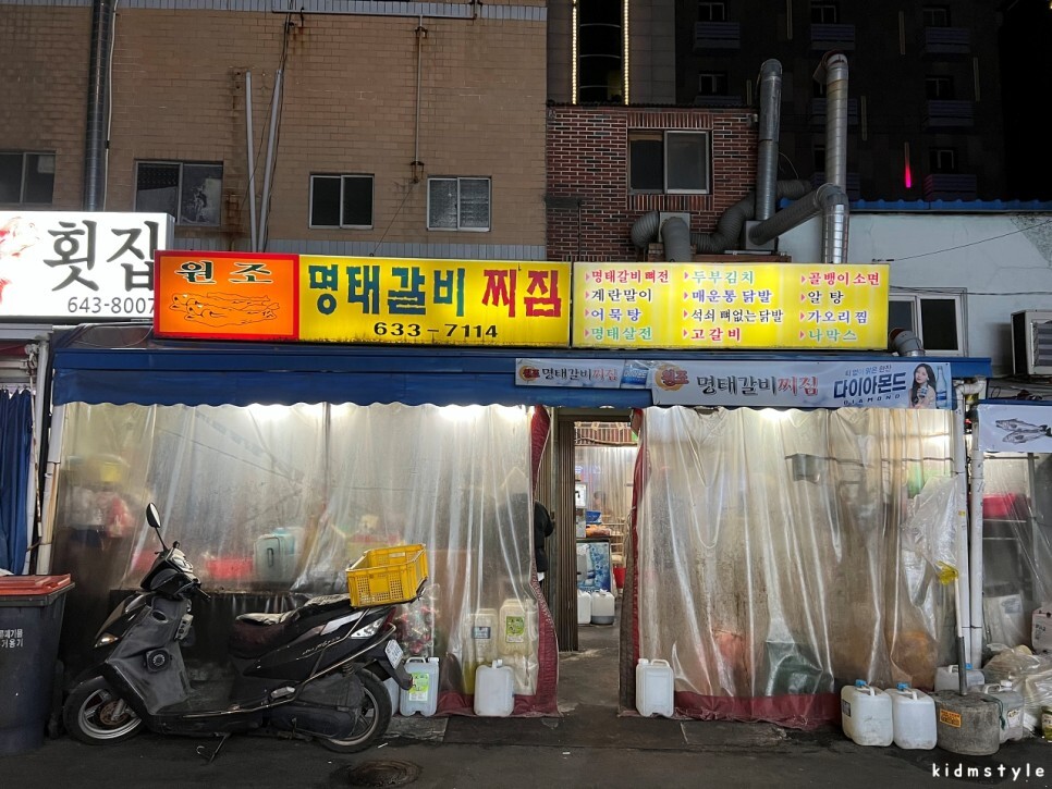 조방숯불곱창에서 1차를 마시고 2차는 오징어회를 먹으러 가기로 했다. 그런데 썩은다리 근처에 횟집들을 돌아보니 마침 다들 오징어 재고가 없다네? 어딜 갈지 고민하다가 예전에 한잔하던 집으로 가보기로 한다. 원조 명태갈비찌짐이라는 집이다.