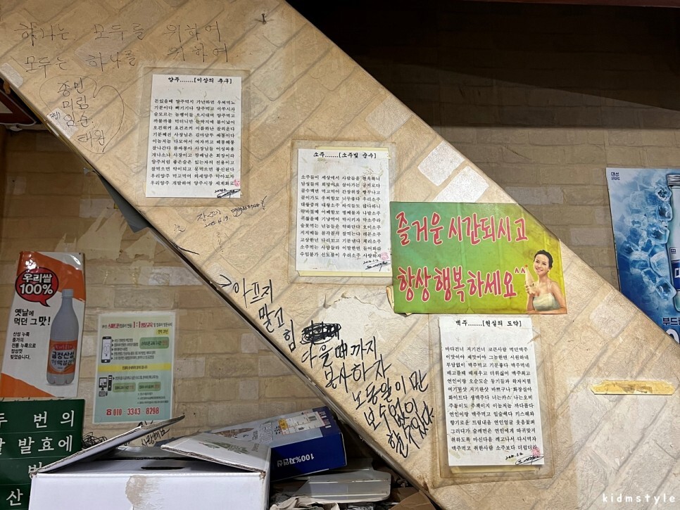 자리를 잡고 고개를 돌리니 뭐가 많이 붙어있다. 자세히 보니 양주, 소주, 맥주에 대한 글이네. 그리고 즐거운 시간 되시고 항상 행복하세요^^