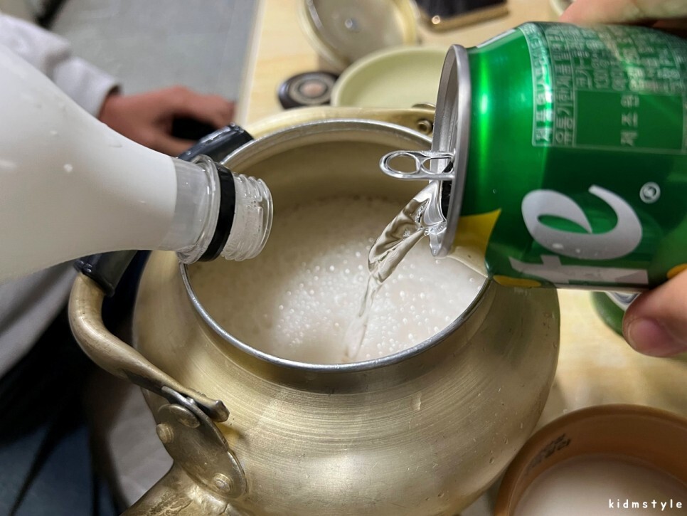 갑자기 누군가 오래간만에 이통일반 한번 가자라고 말한다. 막걸리 2통, 사이다 1통을 이통일반이라고 부른다. 술 좀 마셔본 분들은 누구나 알듯한 이통일반 참 오래간만이다. 막걸리 자체를 오래간만에 마신다. 술과 음료가 나오자마자 앞다퉈서 제조하는 적극성이 넘치는 이들이다. 나는 여유 있게 사진을 찍어본다.