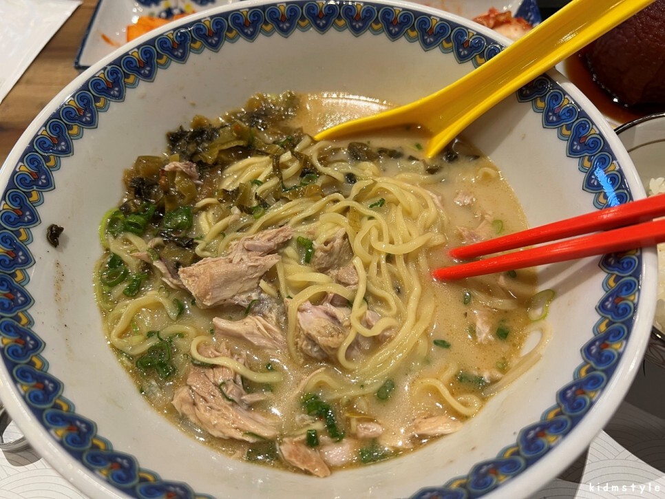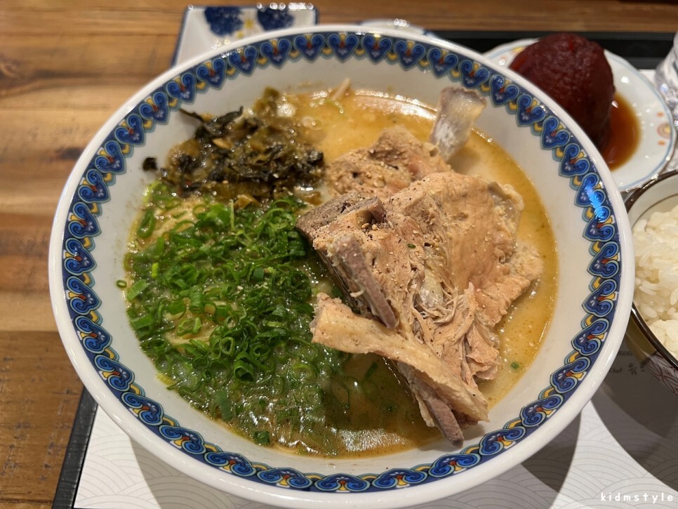 비주얼 좋다. 잘게 썰어놓은 갓절임과 파, 그리고 뼈째로 들어가 있는 등뼈가 눈에 들어온다.