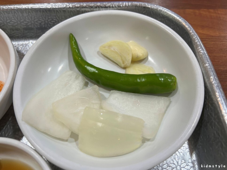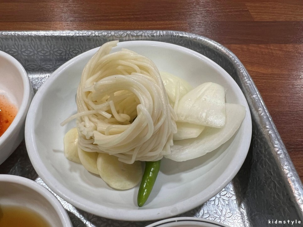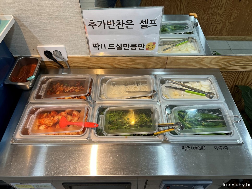 입구 쪽에 있는 셀프 코너입니다. 소면을 가져다 먹을 수 있어서 참 좋습니다. 고추도 땡초와 풋고추가 잘 구분되어 있어서 취향껏 맛볼 수 있습니다.