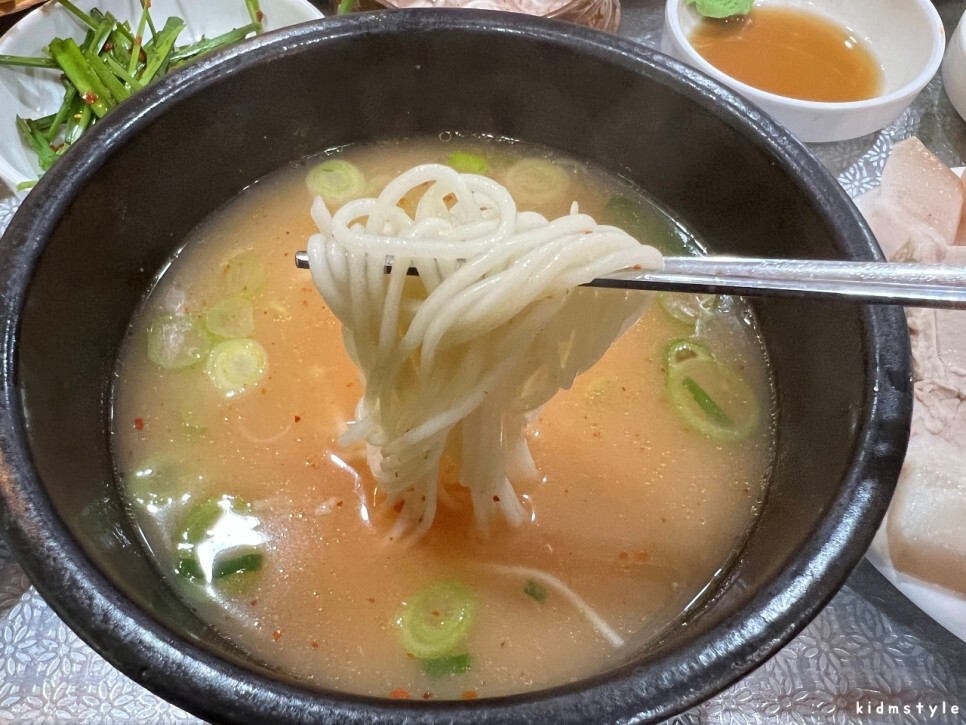 국물 안에 들어가 있는 다대기를 건져보았습니다. 육수는 10시간 이상 끓이면서 우려내는 돼지 사골 육수입니다. 그리고 육수에 기본 간이 되어 있어요. 정성이 들어간 육수라 그런지 맛을 보니 깊은 맛이 우러나네요. 맛있는 국물입니다.