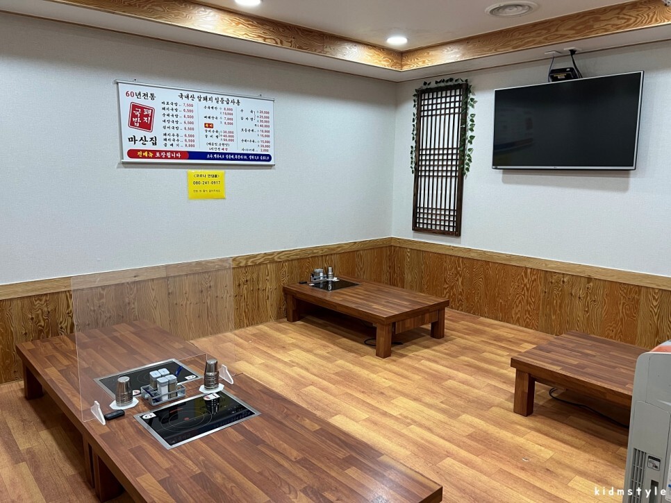 실내는 깔끔하고 잘 정돈된 모습이에요. 벽면에 붙어있는 기와 모양의 인테리어, 창살 등을 보니 차분한 분위기를 연출해 주네요. 원활한 촬영을 위해서 점심시간을 피해서 방문했습니다.