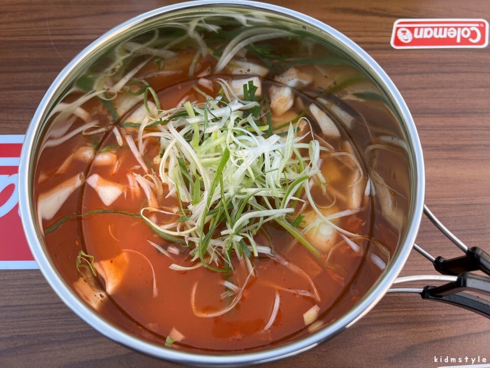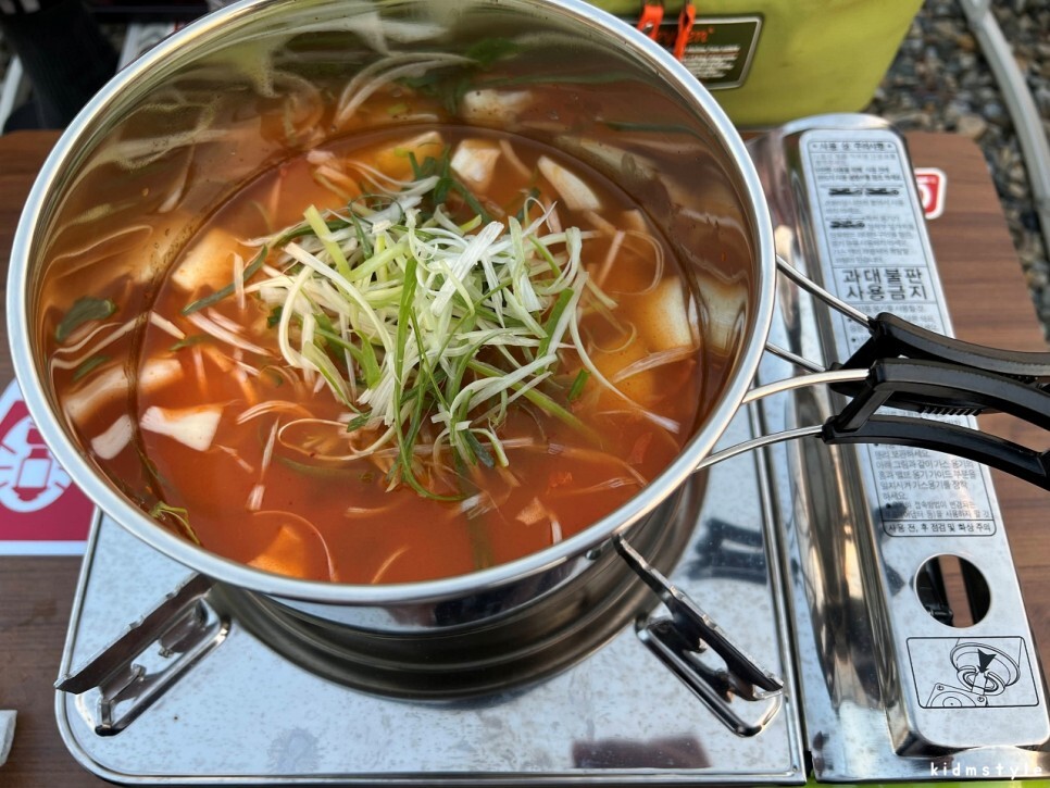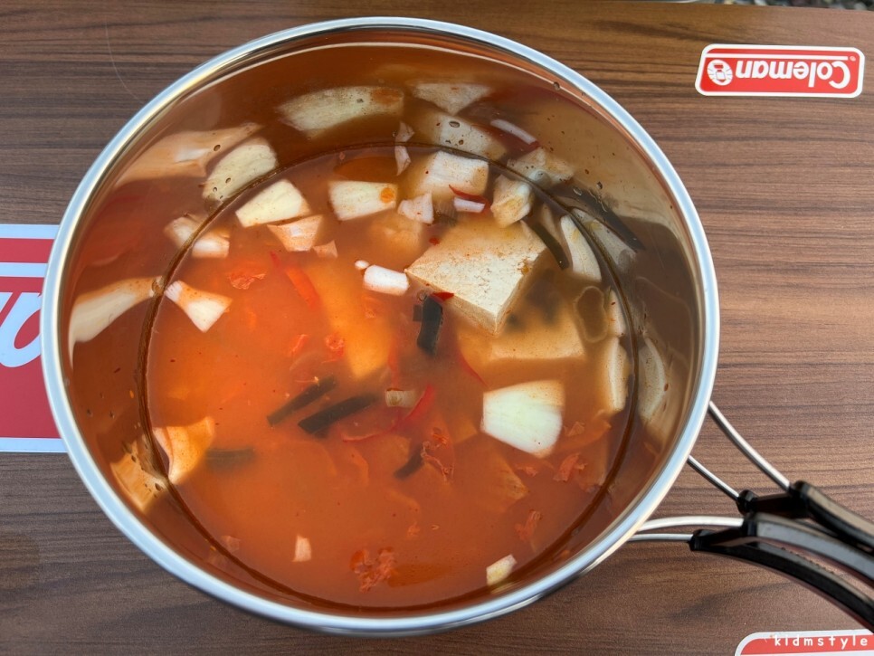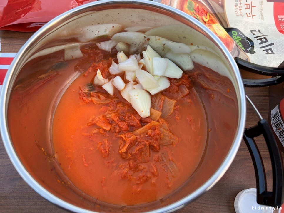 코펠에 먼저 김치 소스를 부었다. 양파는 따로 추가를 했다.