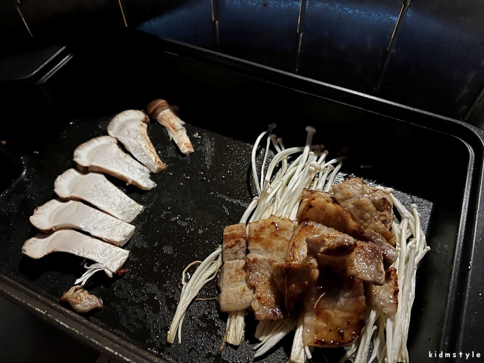 삼겹살을 굽고 송이버섯도 구우니 아주 맛이 있다. 김치찌개와 잘 어울리는 메뉴이다.