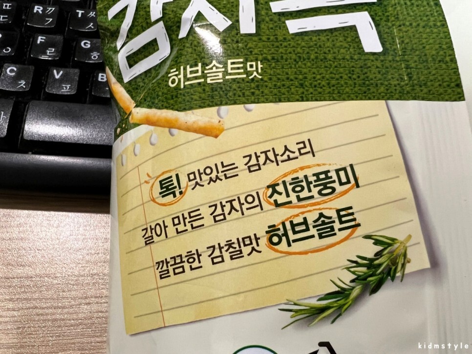컴퓨터 작업을 하면서 먹으려고 젓가락으로 집어먹어본다. 이렇게 먹으면 상당히 편하다. 맛을 보니 매콤달콤맛과는 다르게 매콤함은 거의 없고 허브솔트맛이라는 이름답게 짭짤하다. 담백한 감자과자 같은 맛이 느껴진다. 맨입으로 먹기에는 조금 아쉽다. 하지만 맥주 한 캔을 가져와서 같이 먹으니 꽤 괜찮다. 개인적으로는 매콤달콤맛을 추천하지만 매콤하고 자극적인 것을 싫어한다면 허브솔트맛이 더 나을 수도 있겠다.