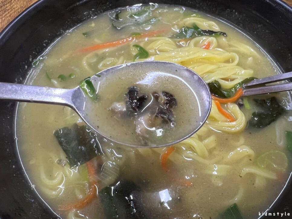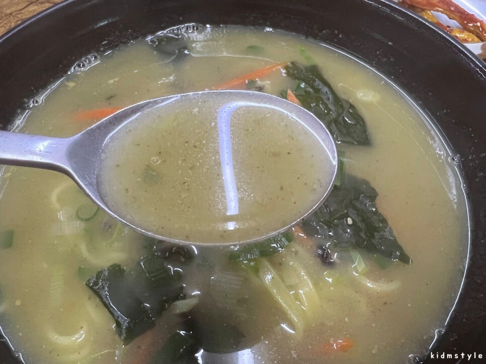 국물을 떠보니 아주 진하다. 그리고 맛을 보니 상당히 맛이 깊다. 왜 제주 현지분들이 단골이 많은지 알겠다. 국물이 상당히 맛있네. 깊은 맛이면서도 보말의 역할인지 고소하고 아주 시원한 맛을 보여준다. 국물을 계속 떠먹게 된다. 해장하러 왔다가 시원한 국물에 막걸리나 소주가 생각나서 한잔하는 경우가 많은 이유를 알겠다.