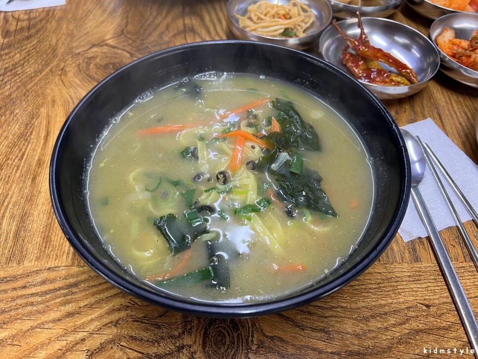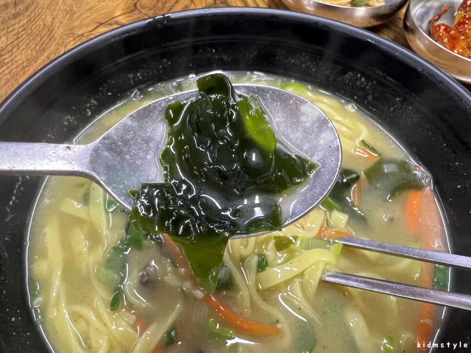내가 주문한 보말칼국수이다. 면, 당근, 보말, 미역, 대파 등이 눈에 들어온다.