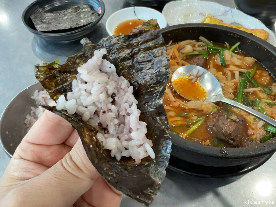 본격적으로 맛보자. 국물을 떠먹어 본다. 시원하다. 국물에서 선지의 맛이 조금 느껴진다. 선지 못 먹거나 민감한 사람은 아예 시도하지 않는 것이 좋을 것 같다.