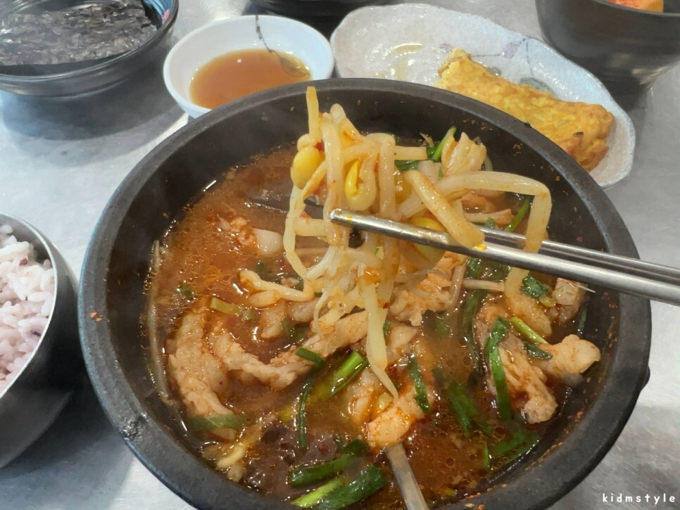콩나물이 들어가 있어서 숙취에 아주 좋다. 수구레국밥은 해장국이라고 보면 된다.