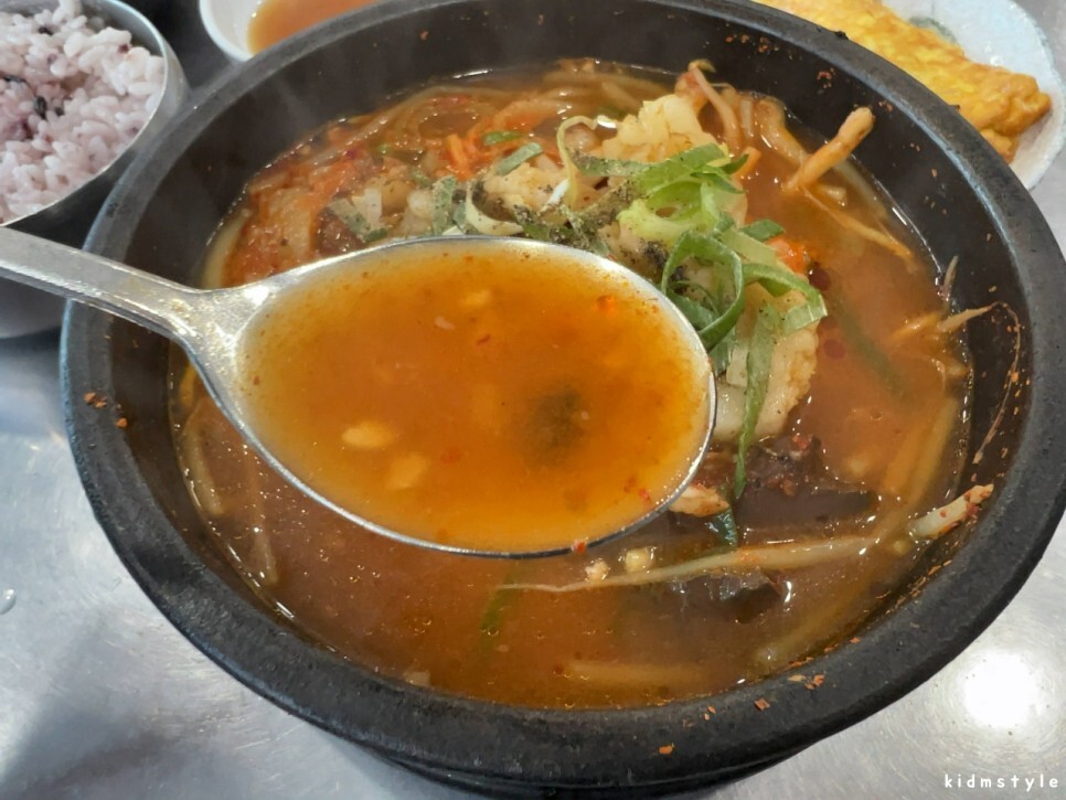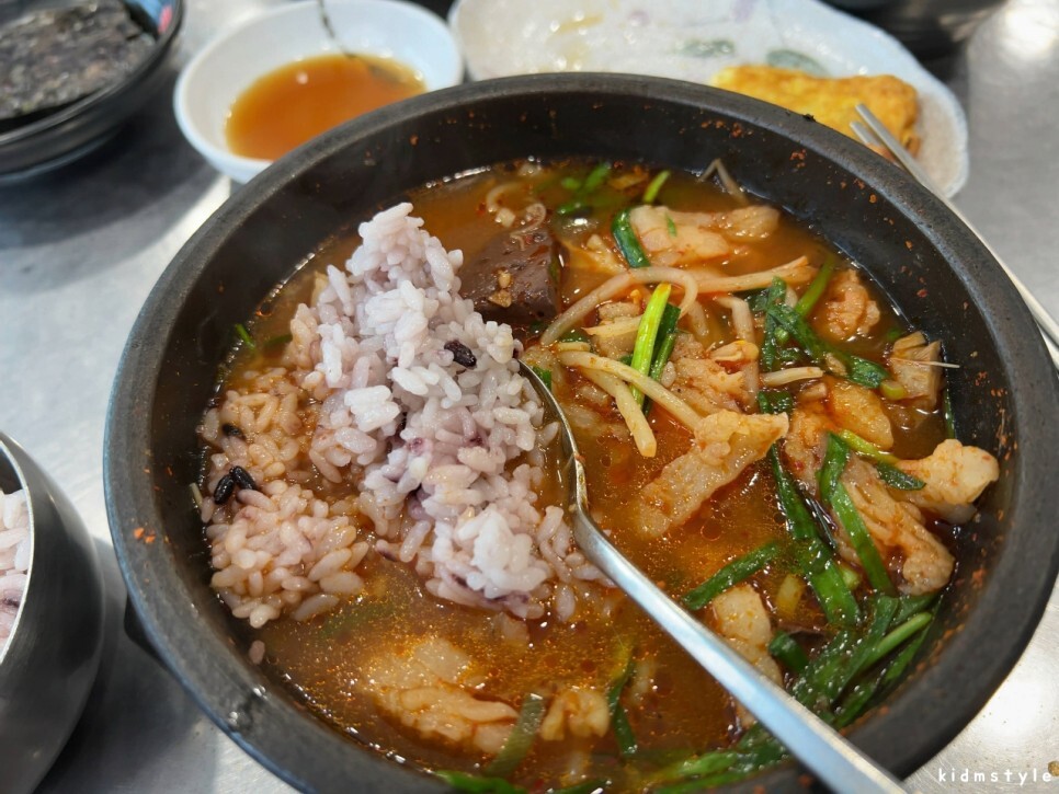 밥 한 숟가락을 넣고 국물에 적신 후 맛본다. 꿀맛.
