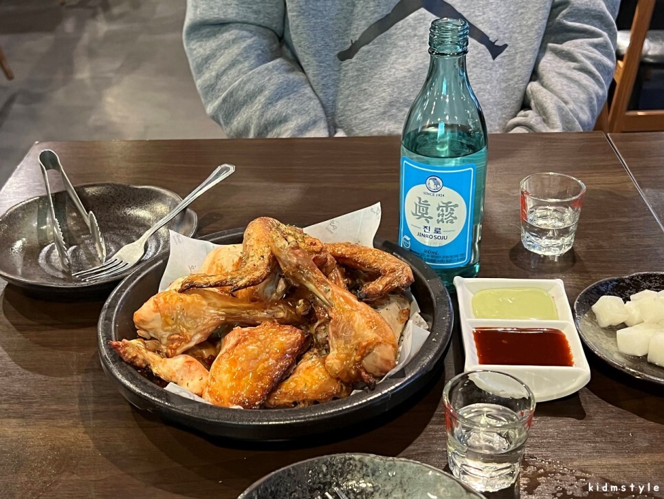 소주 한 잔씩 하고 있으니 닭이 나왔다.