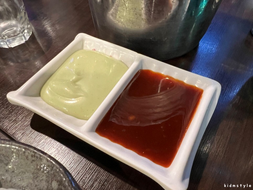 소스를 고를 수 있는데 마요 와사비와 매콤 소스를 요청했다. 빨간 소스 이름이 생각이 안 난다.