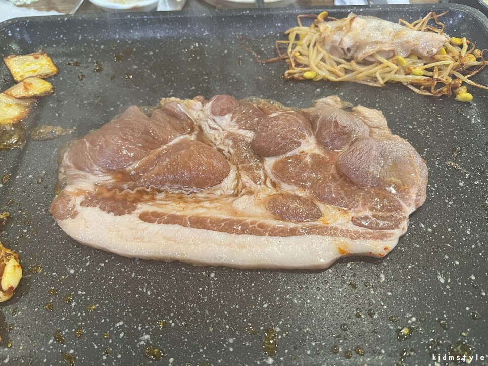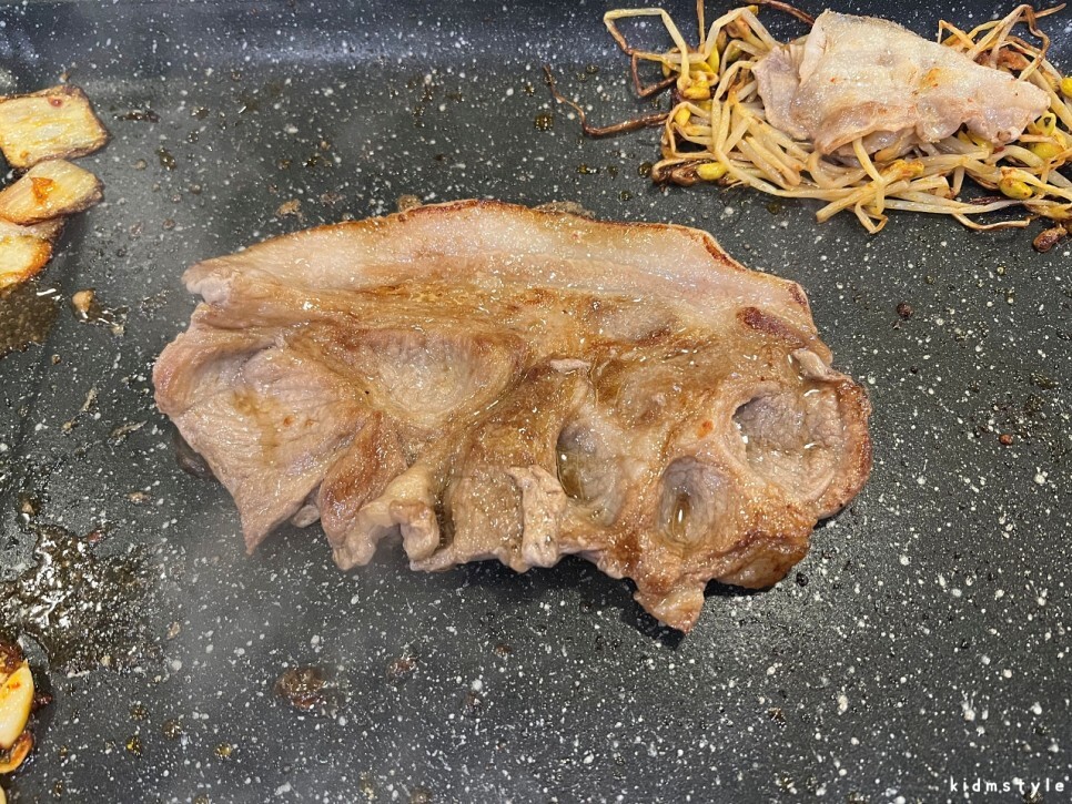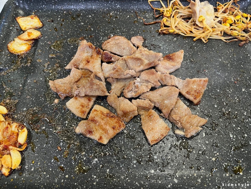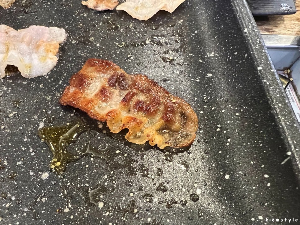 불판은 코팅이 좋아서 집게질하기가 좋다. 사실 대패만큼 굽기 쉬운 부위도 잘 없다. 집게 마스터의 입장에서 봤을 때 코팅 좋은 불판과 대패는 별 신경 쓰지 않고 굽기 쉬운 부분이다. 불판이 기울어져 있으며 왼쪽으로 기름이 흐르는 구조이다. 왼쪽에 콩나물과 김치를 구우면 기름이 적셔져서 맛있는 사이드 메뉴가 된다.