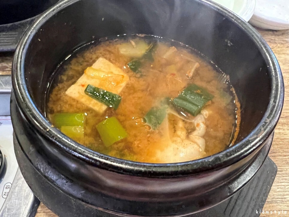 냉동 게 작은 것, 두부, 대파 등 별거 없는 된장찌개인데 맛이 괜찮다. 해물 된찌답게 시원하다.