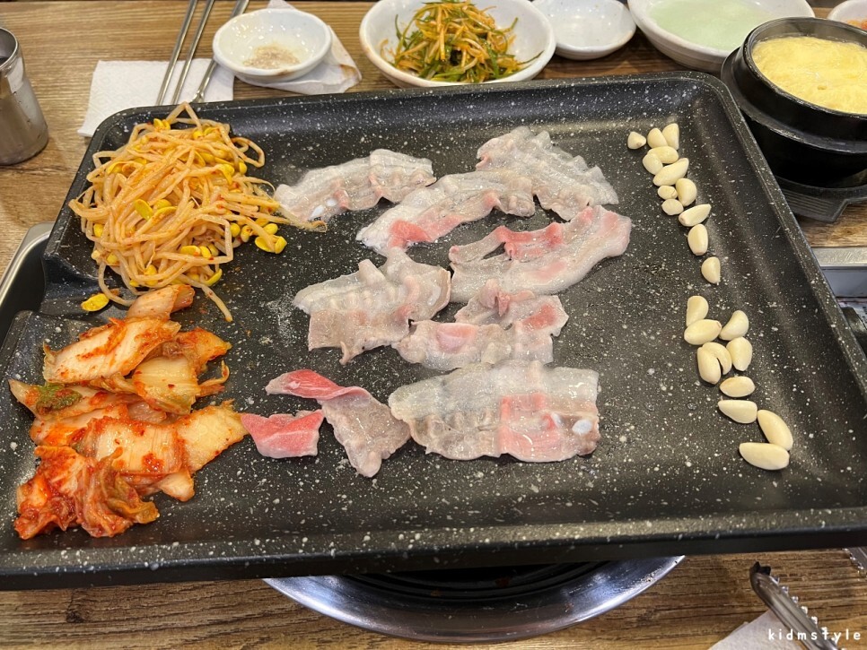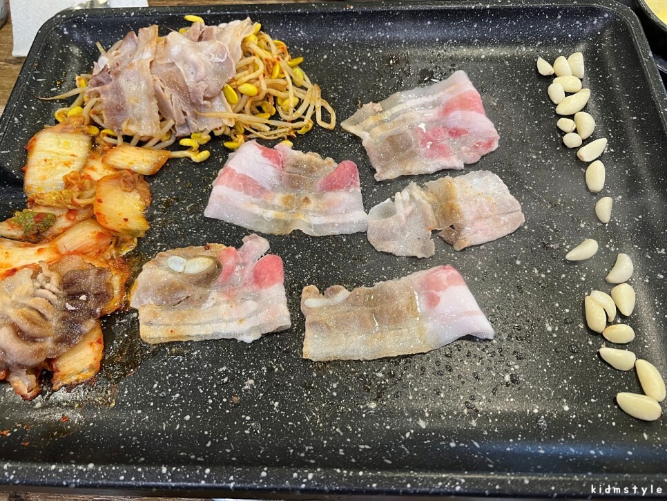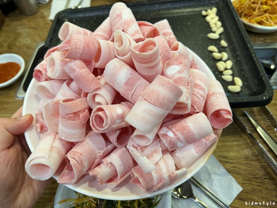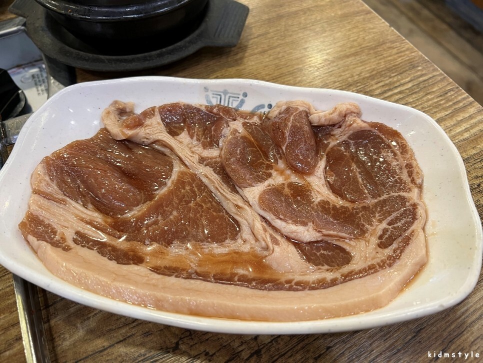 이 집에서 시작 메뉴는 답정너! 대패삼겹살 5인분이다. 대패는 기본 5인분을 주문해야 될 것이다. 아마도. 대패를 잘못 먹으면 다음날 배탈이 잘 나는 스타일인데 이 집 대패를 먹고 속이 안 좋은 적은 단 한 번도 없다. 이 사진만 봐도 군침이 돈다. 인정? 어~ 인정!