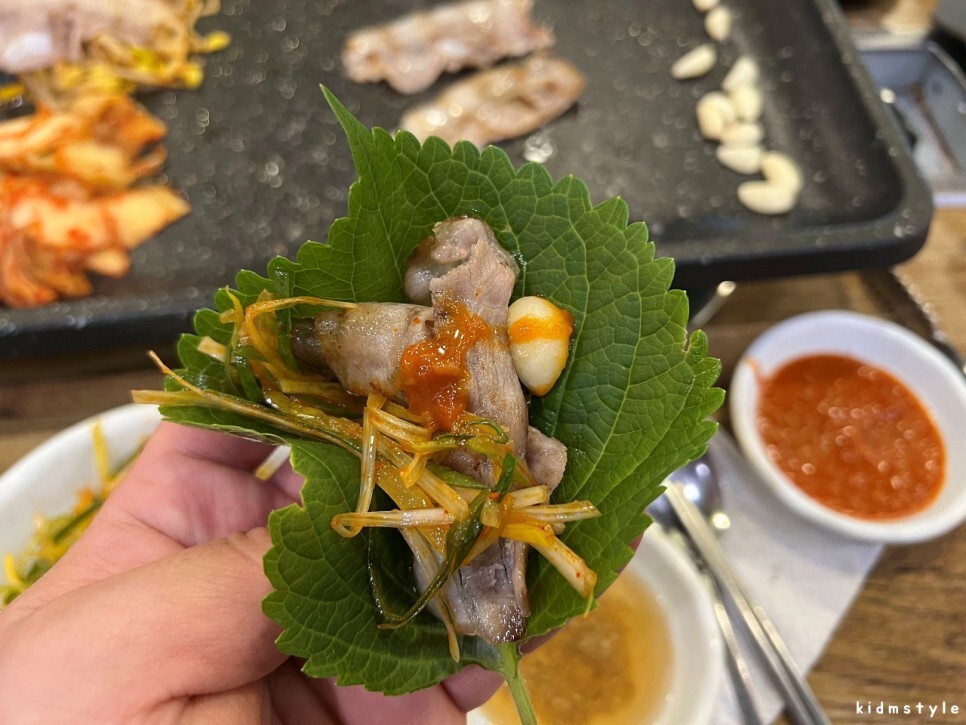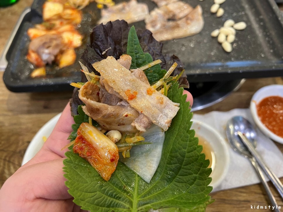 바삭하게 굽는 게 포인트이다. 물론 내 기준이다. 함께한 이는 허옇게 살짝 적당히 구운 것을 선호한다. 그렇게 구워도 상당히 맛이 있다. 깻잎 쌈 한 쌈 싸고 소주 한 잔 잔치고 맛보니 꿀맛.