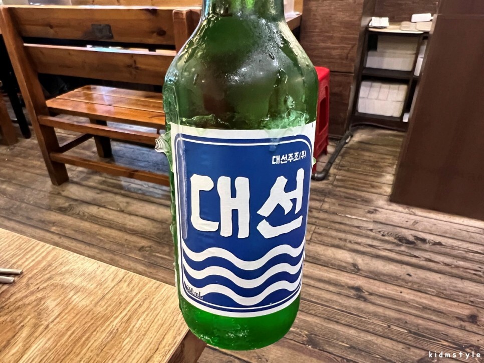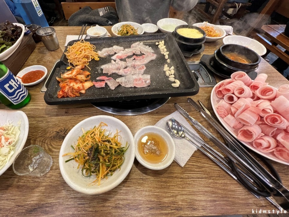 잘 차려진 대패 한 상이다. 부산 사람 대선 소주 1병 주문은 기본이고. 계란찜, 된장찌개는 기본 서비스로 나온다. 쌈, 마늘, 김치, 콩나물은 입구 왼쪽에 있는 셀프 코너에서 추가로 가져오면 된다.