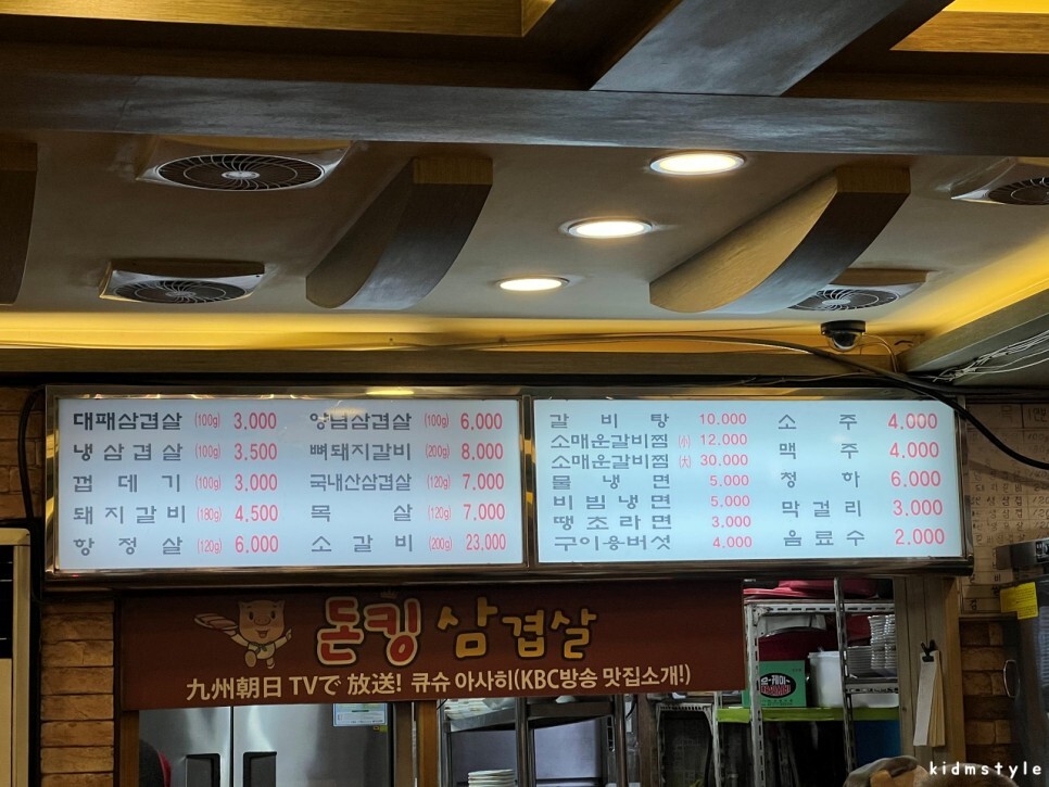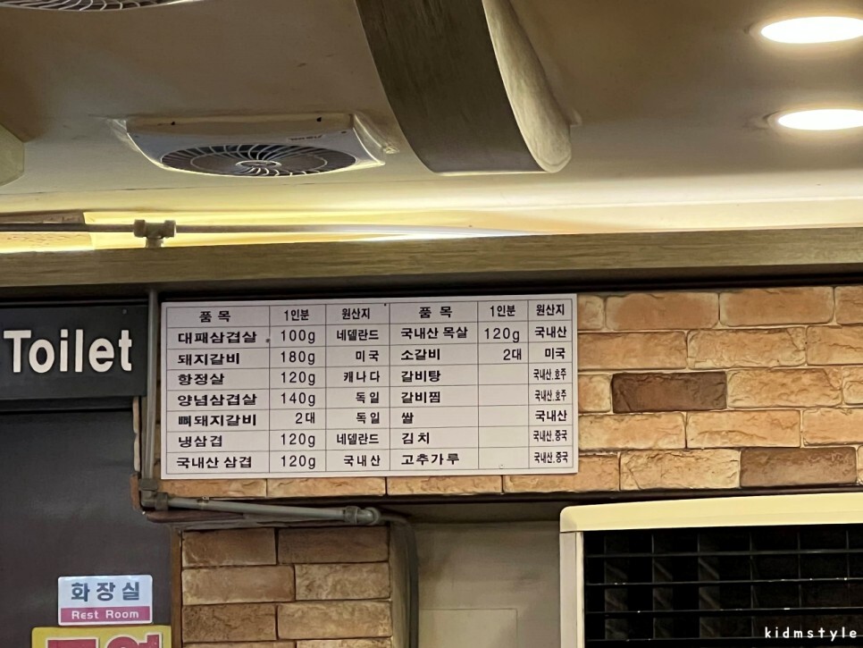 자리를 잡고 메뉴판을 찍어본다. 가격이 오르긴 했지만 대패삼겹살 100g에 3,000원이면 매력적인 가격이다. 늘 대패를 먹고 나서 180g 1인분에 4,500원 하는 돼지갈비를 주문한다. 수입산이고 목살 부위지만 말 그대로 가성비로 접근하기에 참 좋다.