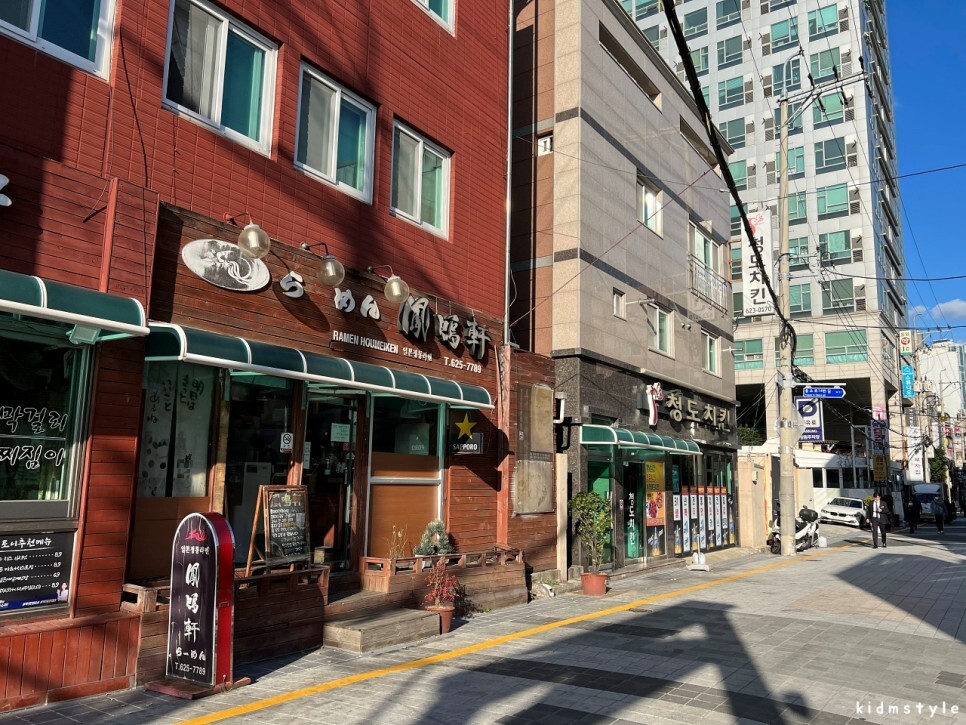 오늘 가볼 호메이켄 라멘이다. 문을 열고 들어가니 브레이크 타임이라 영업을 안 한다고 하네? 네이버 마이 플레이스에는 브레이크 타임에 대한 언급이 없던데 아쉽다. 혹시 관계자가 이 글을 본다면 네이버 가게 소개에 브레이크 타임 정보를 기입해 주기를 바란다. 적어도 다른 손님들이 나처럼 헛걸음하지는 않을 테니까 말이다. 오른쪽에 아주 반가운 닭집이 보인다. 청도치킨! 와, 진짜 오래간만이다. 대학시절 친구들과 가면 1인 1닭에 소주 마시던 추억이 있는 곳이다. 당시에 일주일에 한 번은 갔던 곳인데 언제 한번 가봐야겠다.