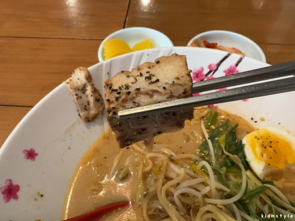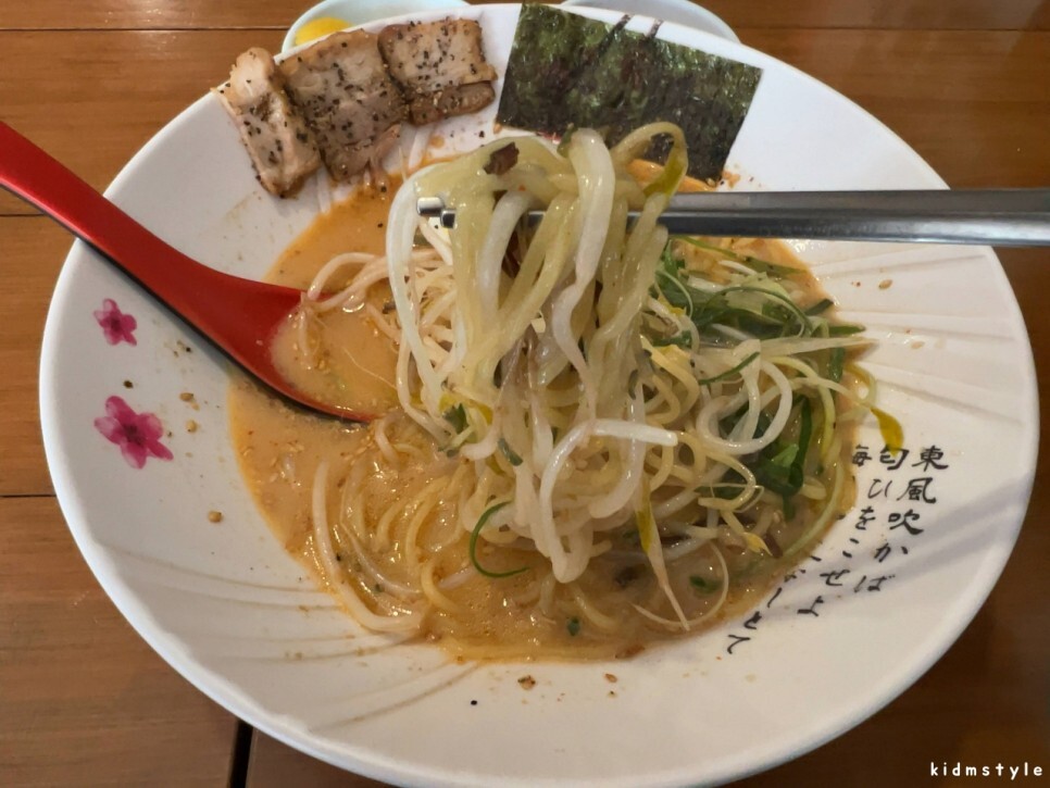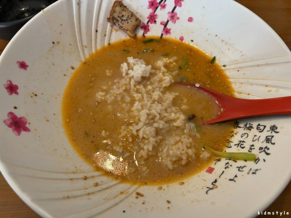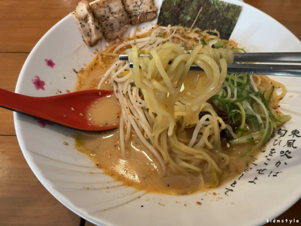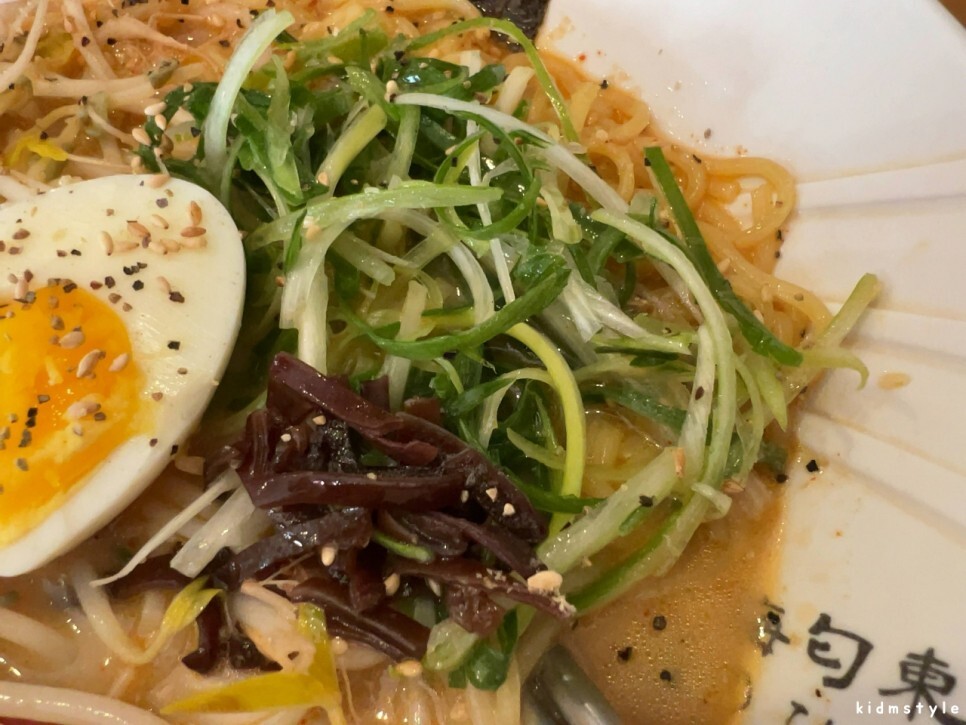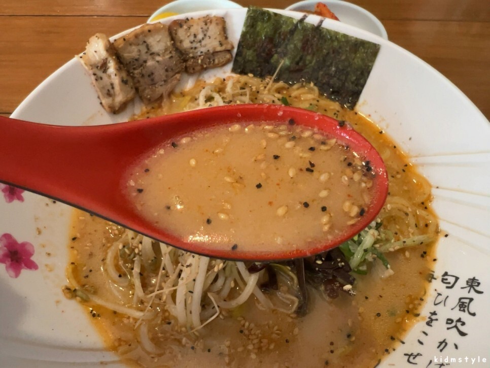국물은 진하다. 깨가 많이 뿌려져 있다. 국물을 맛보니 생각했던 그 맛이다. 우리 입맛으로 많이 개량된 맛이다. 라멘과 라면의 중간 맛이라고 할까? 그냥 4,900원의 가성비로 먹기에 딱 좋은 느낌이다. 일본식 라멘을 기대했다면 조금 아쉬울 것이다.