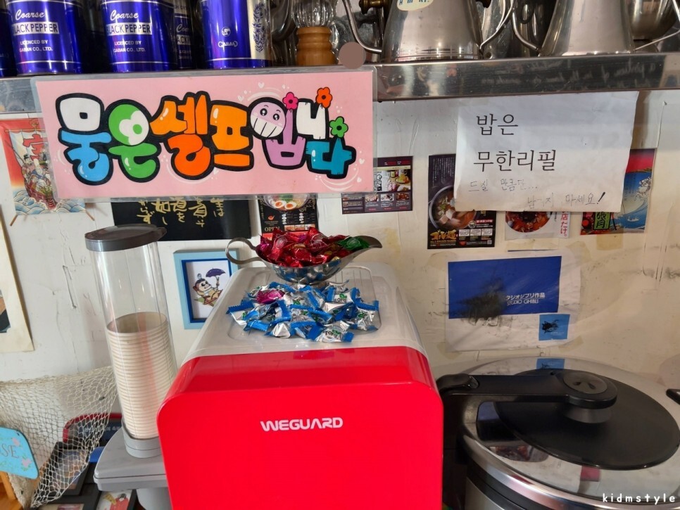 물은 셀프이고 식사 후 입가심용 사탕이 눈에 띈다.