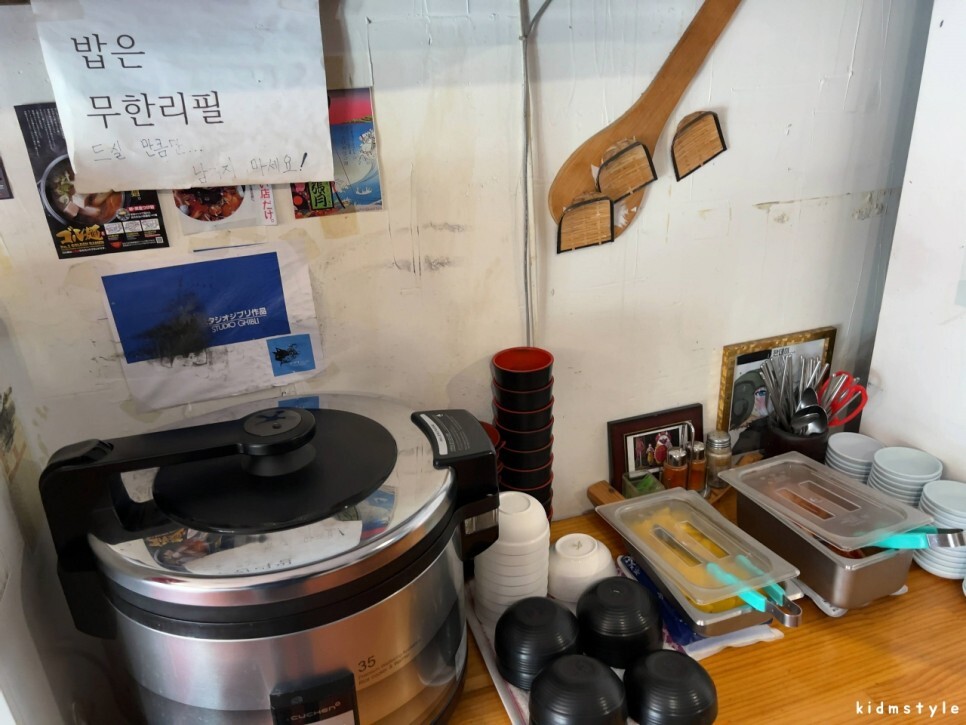 밥솥에 밥이 있다. 무한리필이다. 먹을 만큼만 가지고 가서 먹으면 된다. 단무지와 김치도 가져다 먹으면 된다.