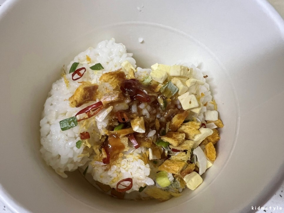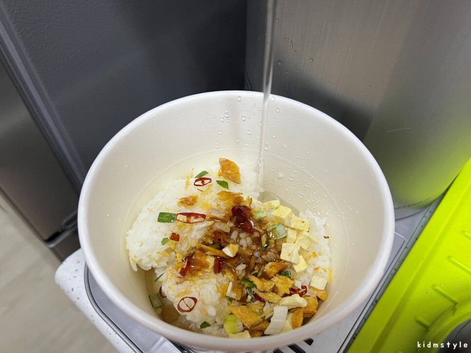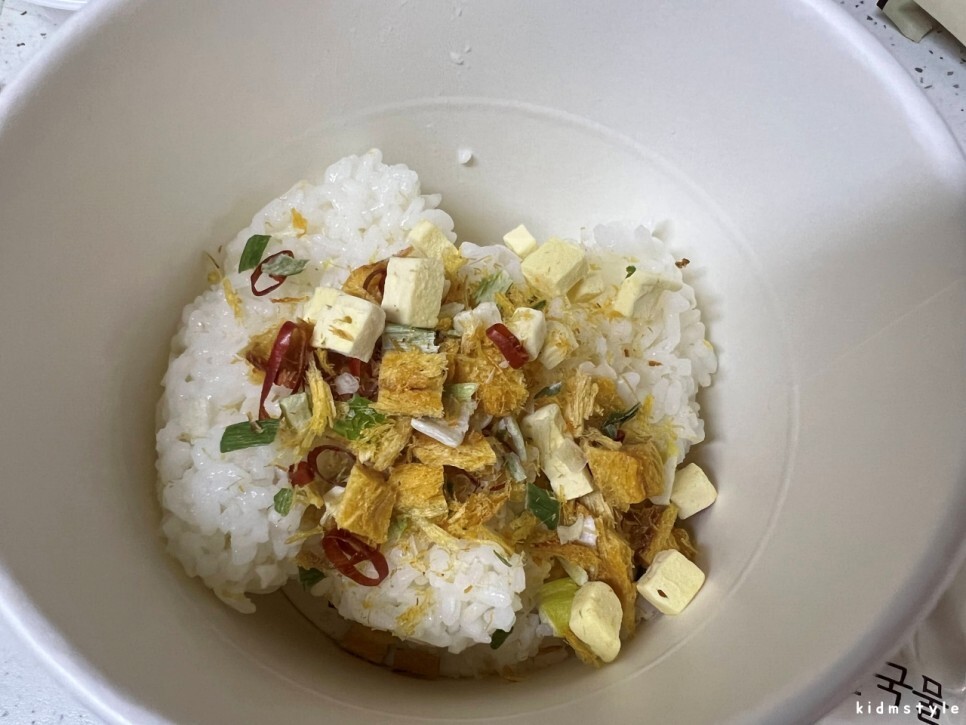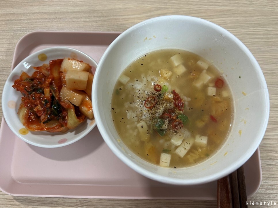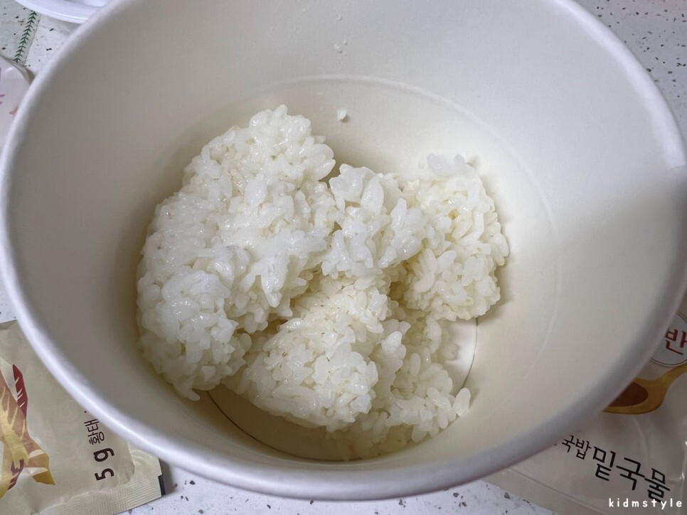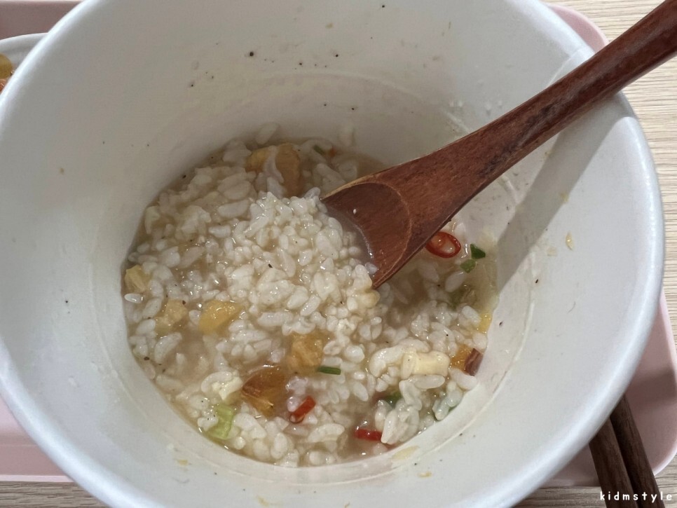 처음에는 맑은 국밥인데 먹다 보면 시간이 흐를수록 죽처럼 되직해진다. 뜨거운 걸 식히다 보면 보통 죽처럼 되는 이 시점에 식사를 하게 된다. 죽처럼 되었을 때가 더 맛있다. 국물은 칼칼하다. 약간 간이 세다고 생각될 수도 있으니 처음 맛본다면 컵반을 먹어보고 본인의 스타일에 맞게 스프를 맞추면 될 것 같다. 아니면 물을 조금 더 넣고 조리하는 것도 괜찮은 방법이겠다.