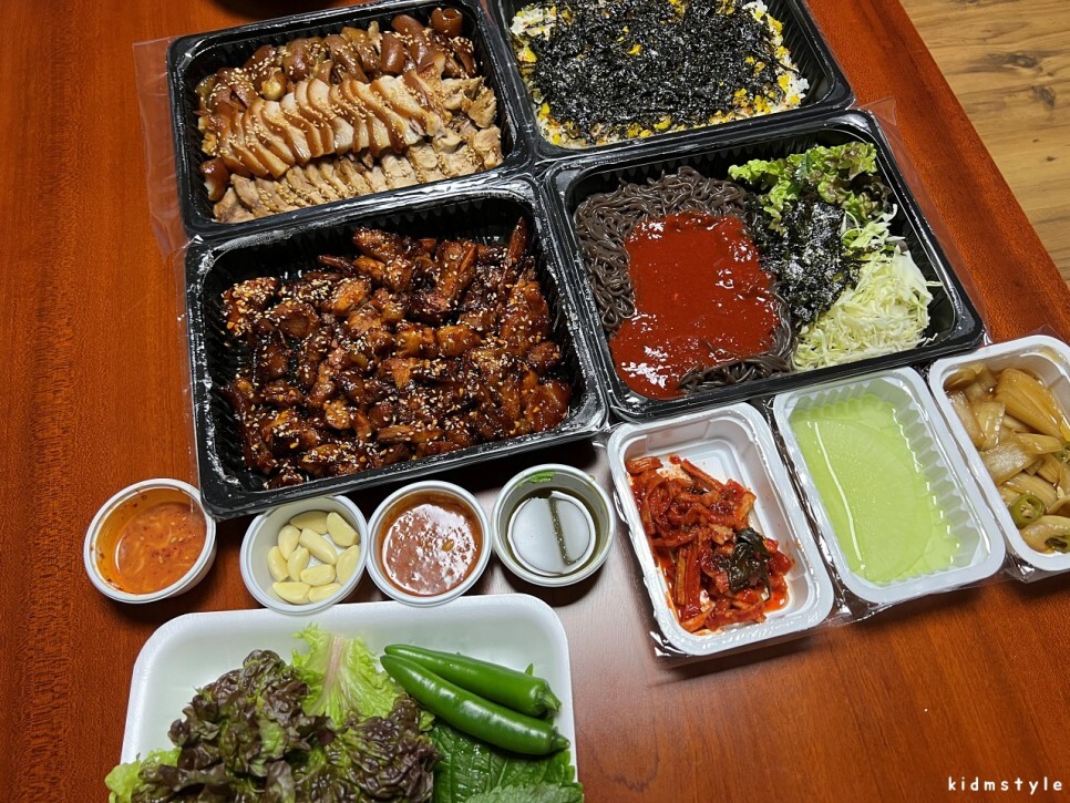족발과 불 족발, 주먹밥, 비빔 막국수까지 화려한 구성이다.