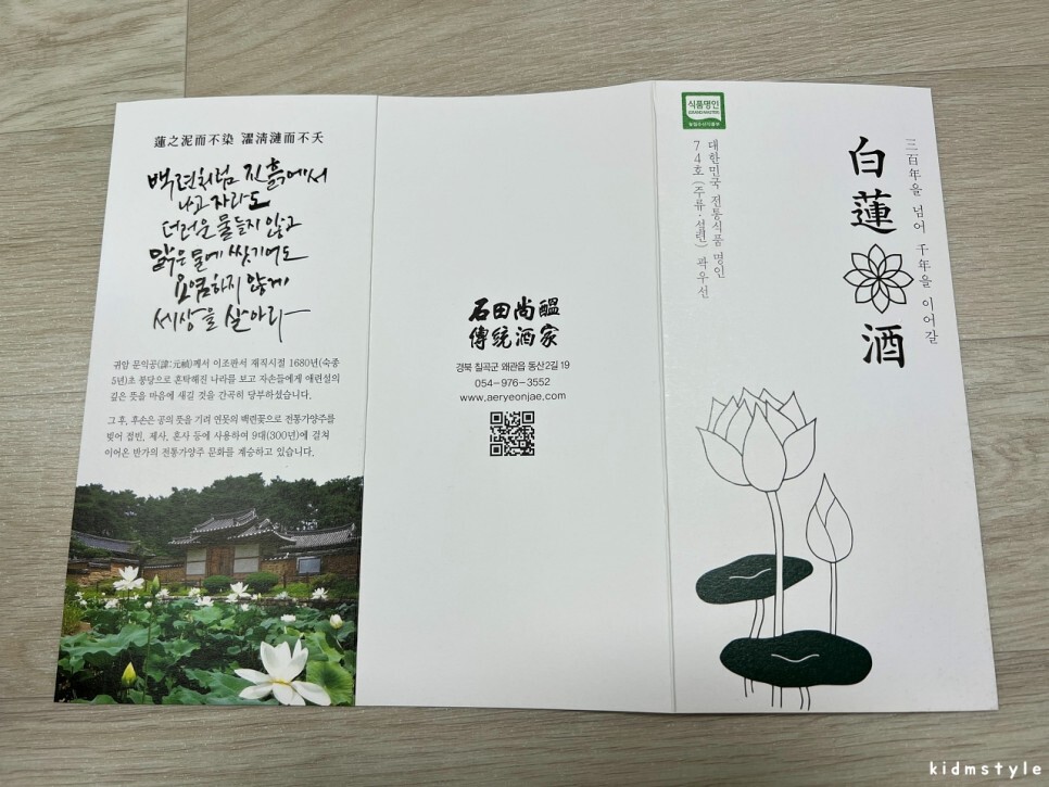 두 번의 덧술 후 백일 이상 발효 숙성 후 맑게 걸러 담은 약주이다. 여름에 하얗게 핀 백련꽃과 잎의 향기를 가득 담고 있으며, 16도의 도수로 단독으로 혹은 다른 음식과 함께 즐기기에 부담이 없는 술이라고 소개한다. 100일 이상의 발효 숙성 때문에 생산이 오래 걸려 품절이 지속되고 있는 것 같다.