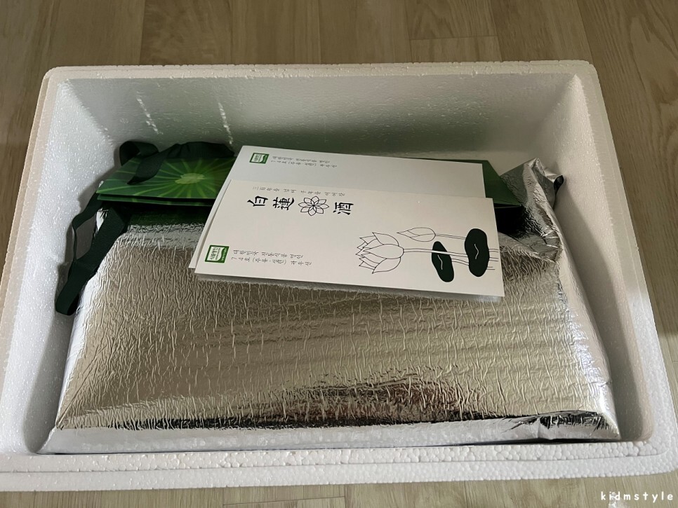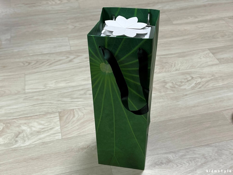 선물용으로 전달할 쇼핑백도 함께 제공된다. 겉에 연잎이 그려져 있다.