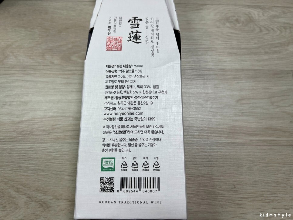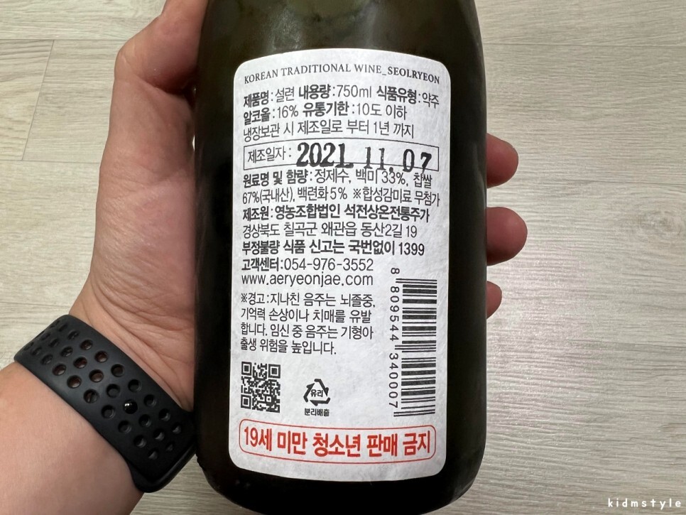 아마 기억으로 가을에 오더를 넣고 11월이 지나서 받았던 것 같다. 한두 달 걸렸을 것이다. 식품유형은 약주이며 10도 이하 냉장 보관 시 1년 정도 보관이 가능하다.