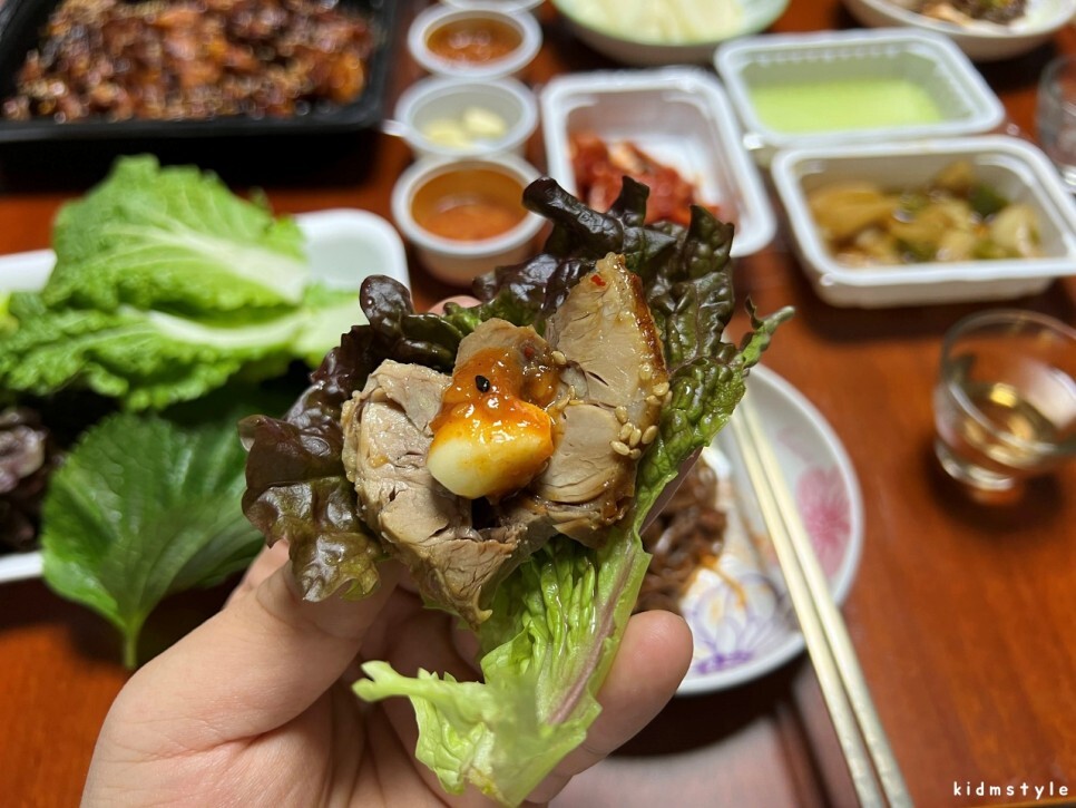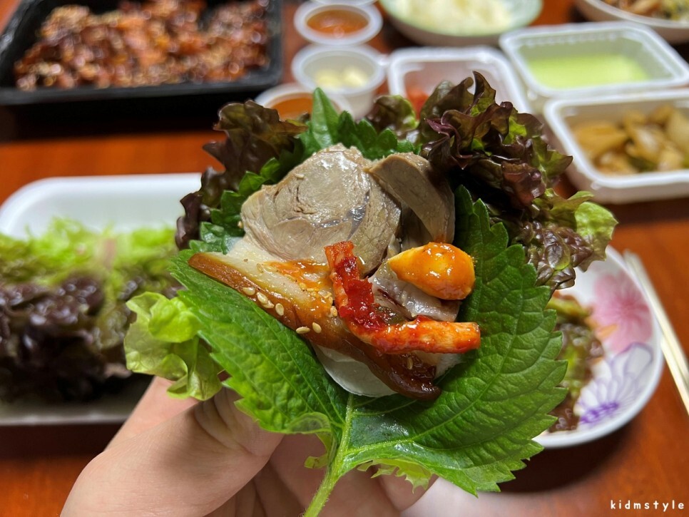술 한 잔을 털어 넣고 상추, 깻잎 쌈을 싸서 쌈무를 올리고 족발을 메인으로 그리고 무말랭이와 마늘도 함께 올리고 맛을 본다. 이 집 족발 참 맛이 괜찮다.