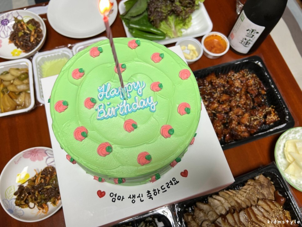 엄마가 직접 디자인을 요청하셔서 동생이 제작 주문한 생일 케이크이다. 딸기인 줄 알았는데 사과라고 하네. 엄마 생신 축하드려요~