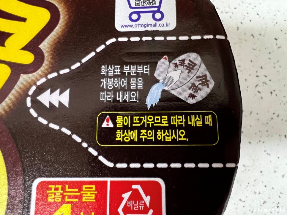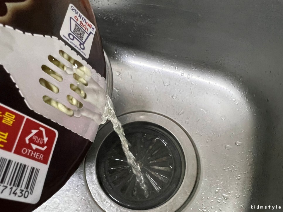 2. 4분 후 뚜껑에 표시된 화살표 부분을 잡고 뜯어내며 물을 버린다.