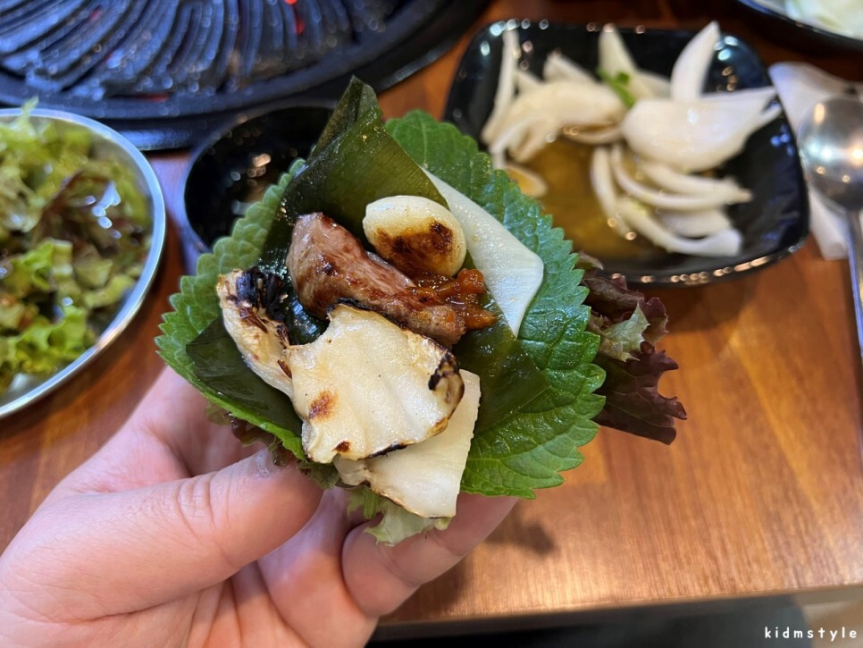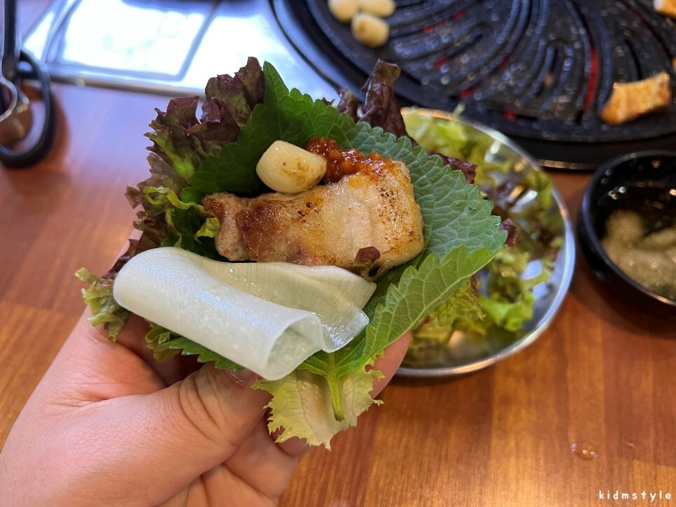 이어서 상추, 깻잎, 쌈무, 명이나물, 목살, 구운 김치 등을 조화롭게 맛본다. 꿀맛이다.