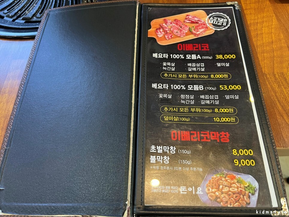 메뉴판을 찍어본다. 2인 이서 가볍게 먹기 위해서 베요타 100% 모둠 A 500g을 주문하였다. 꽃목살, 배꼽삼겹, 덜미살, 늑간살, 갈매기살 등 다양한 부위의 모둠이다. 막창도 궁금하다. 둘 다 막창, 곱창에 환장하기에 일단 모둠을 먹어보고 막창도 주문해 보기로 한다.