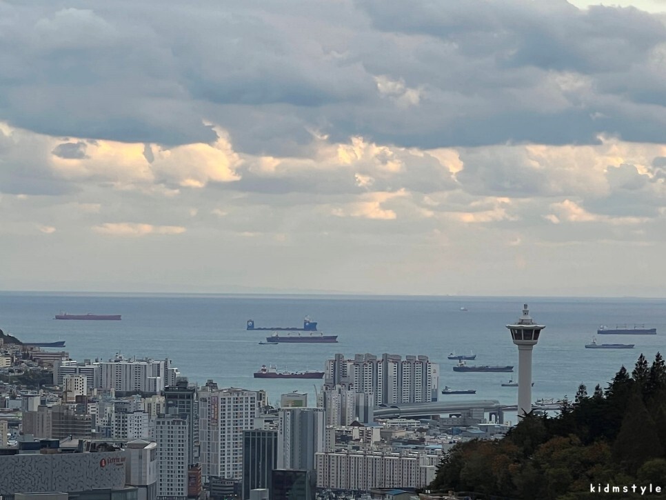 줌을 당겨서 찍어본다. 용두산공원 부산타워가 보이고 저 멀리 수평선 쪽을 자세히 바라보면 대마도가 보인다. 정말 가깝게 보인다. 남항 묘박지에 정박하고 있는 배들이 여유로워 보인다.